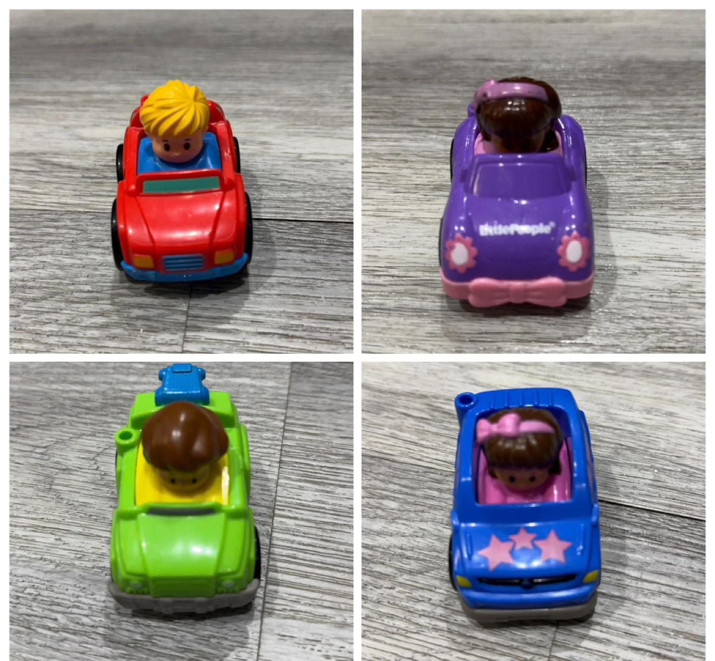Set of four colourful Little People cars,Includes a red car, purple car, green car, and blue car. These toys are great for little hands and encourage imaginative play!
