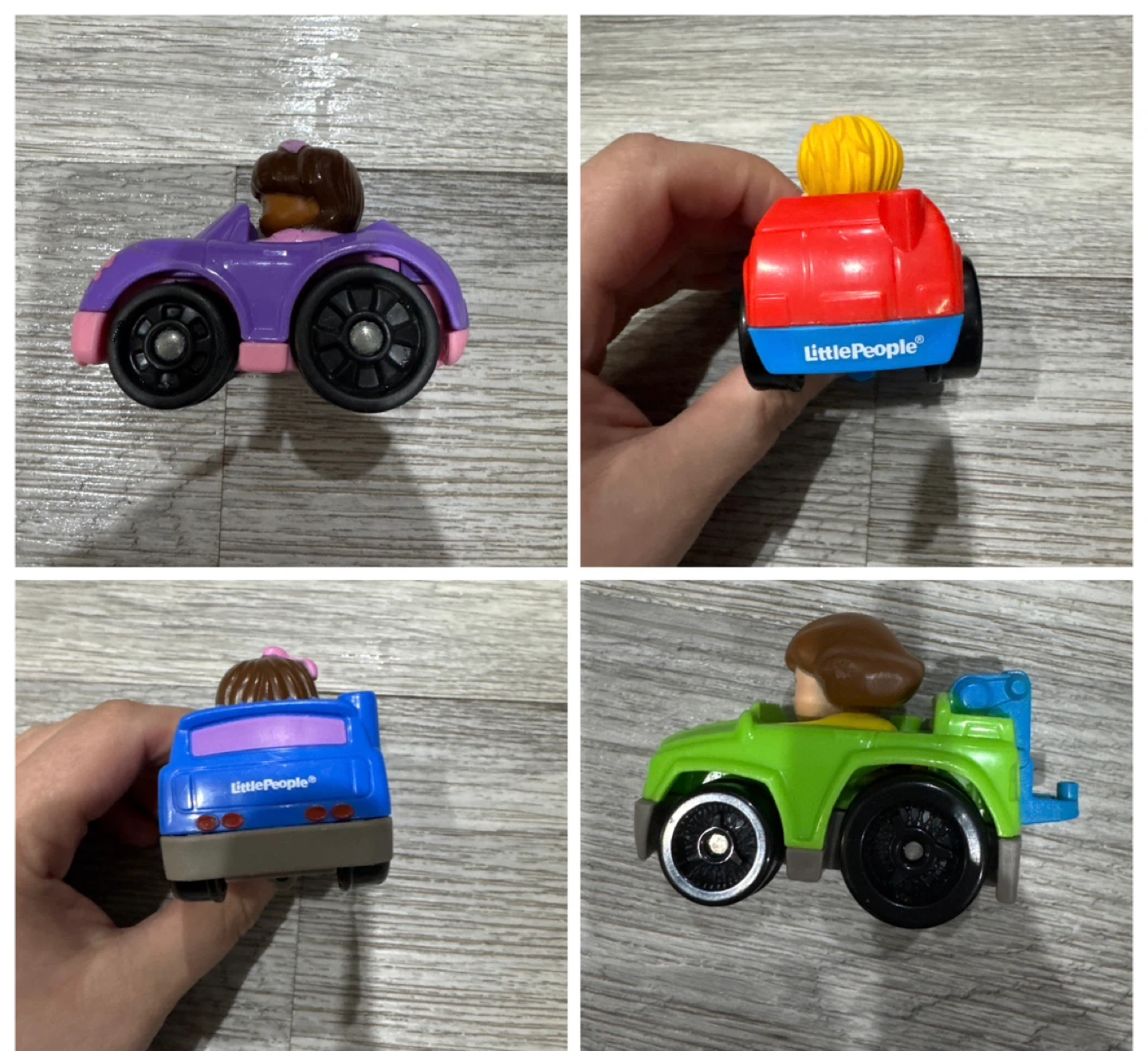 Set of four colourful Little People cars,Includes a red car, purple car, green car, and blue car. These toys are great for little hands and encourage imaginative play!