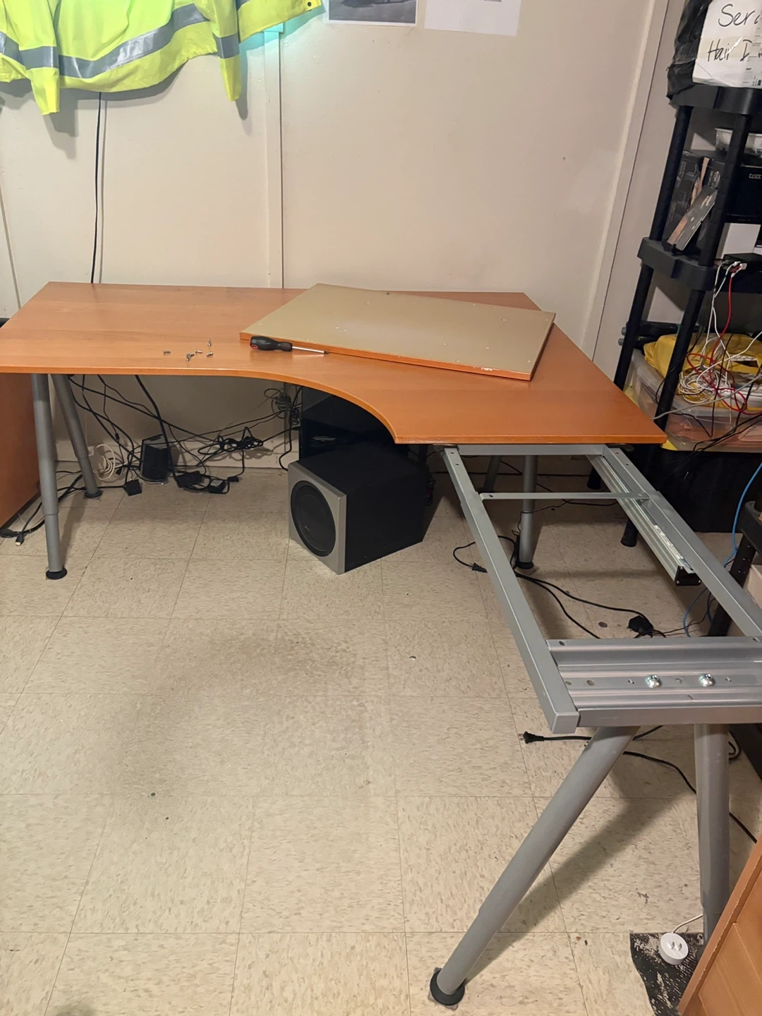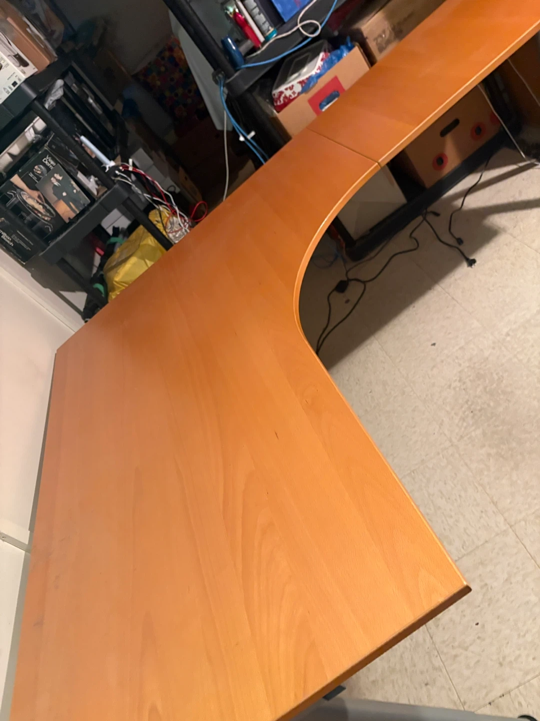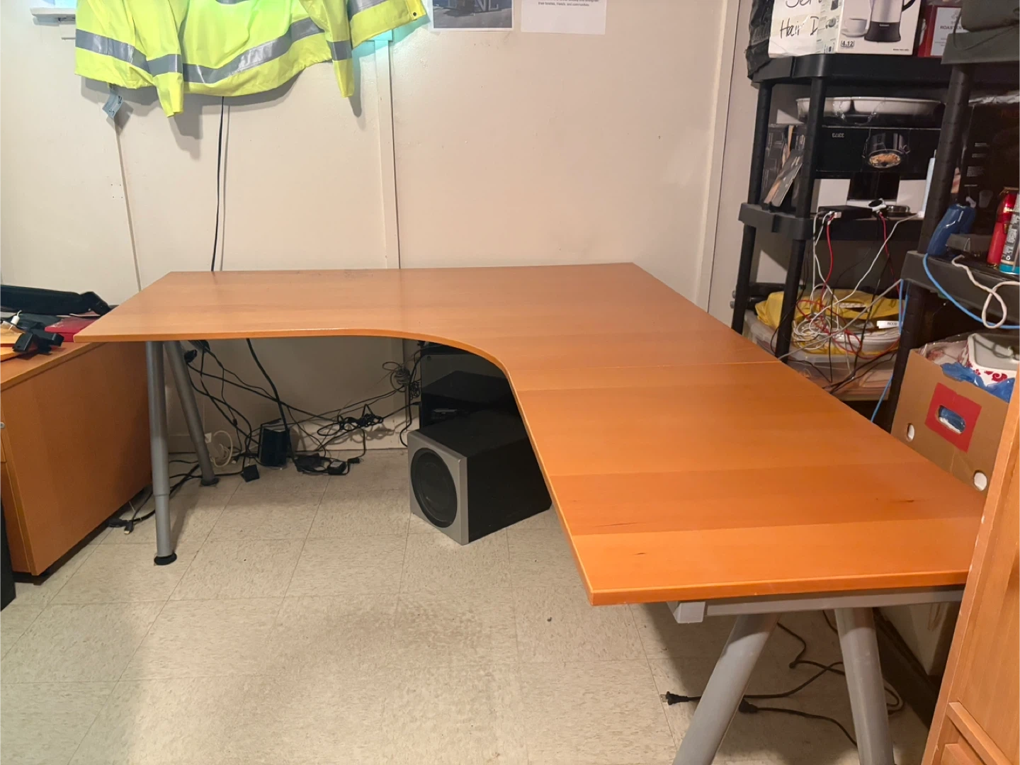 Selling a used L-shaped wooden desk. It's in good condition and perfect for a home office or study space. It's a great size for maximizing corner space and provides ample workspace. The desk is sturdy and has a clean, simple design.