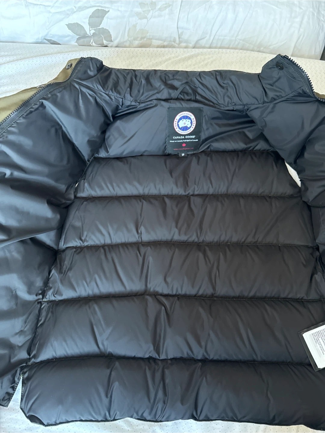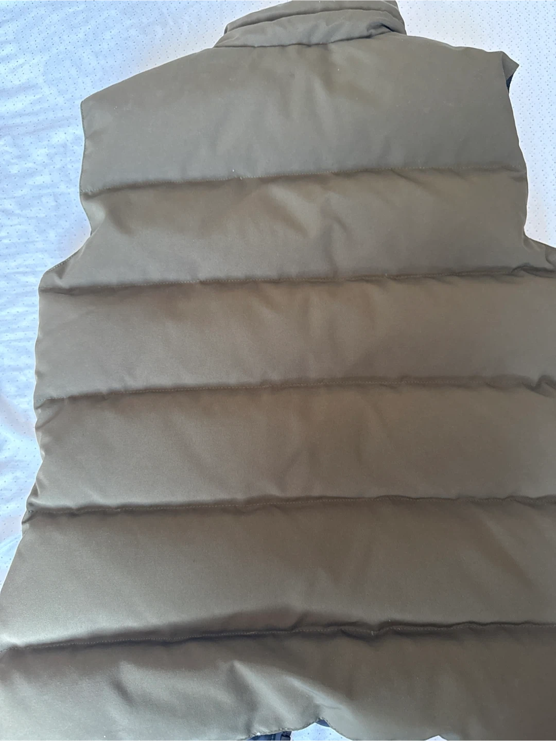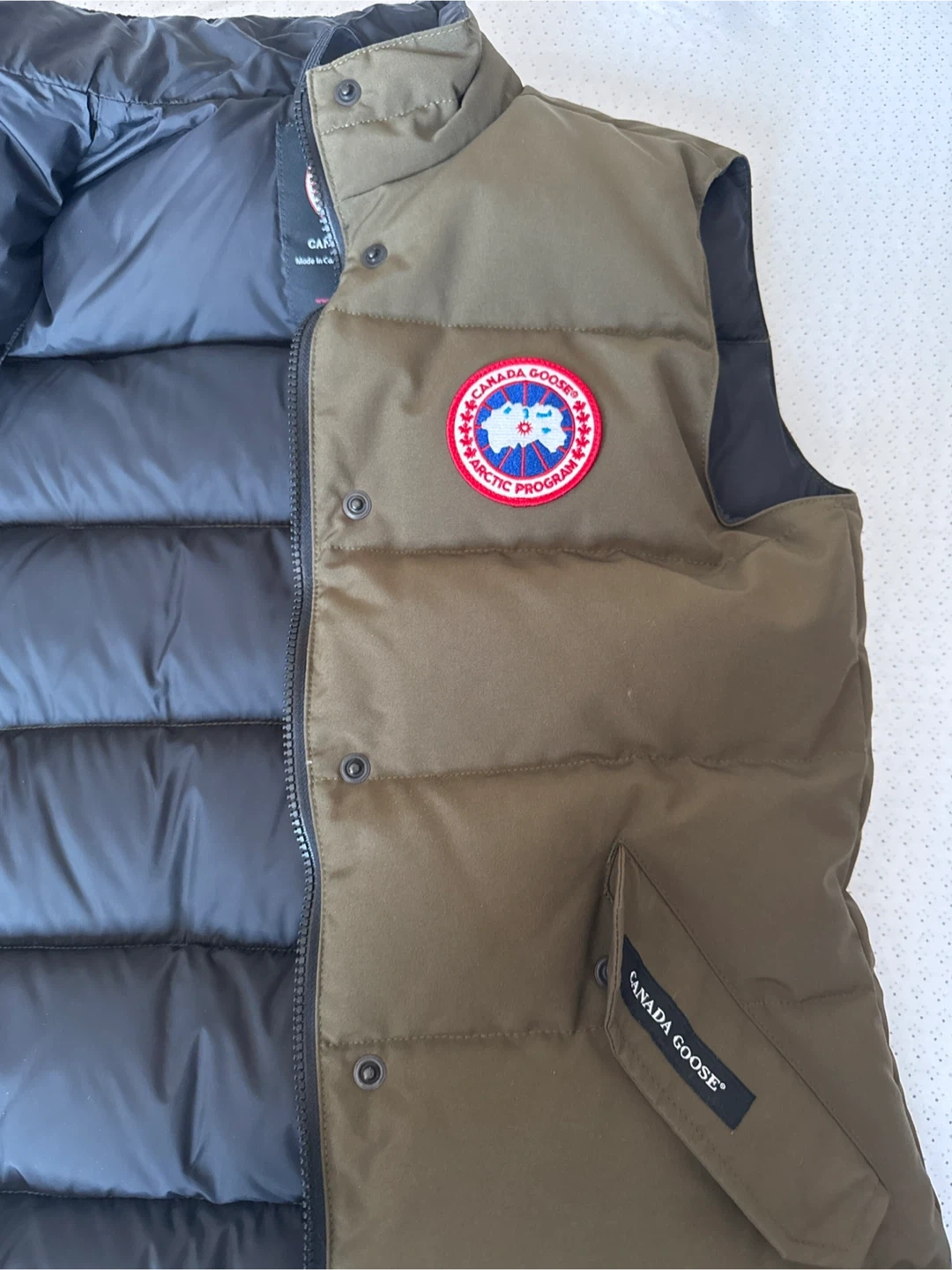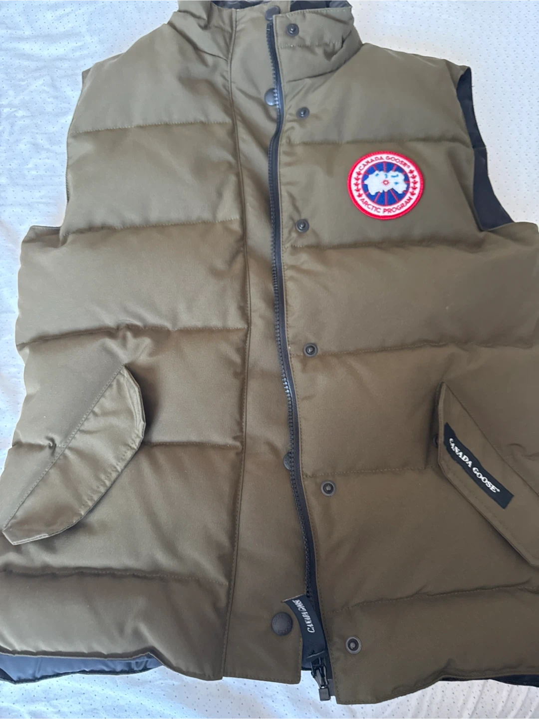 UNISEX: Canada Goose puffer vest in a nice olive green colour. It's perfect for layering on cooler days! Made with down fill for warmth. Made in Canada.