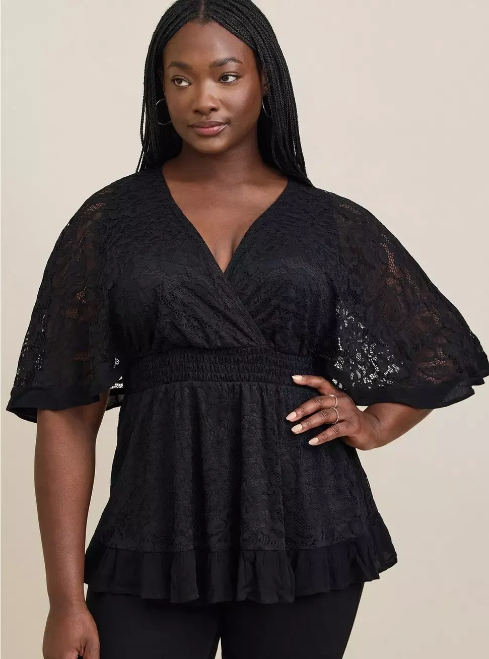 This is a Torrid black lace surplice top. It features a V-neck and short sleeves with lace detailing. Perfect for a night out or a special occasion!
