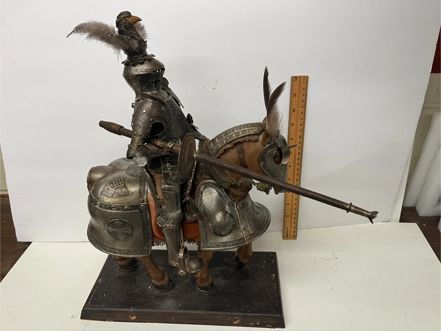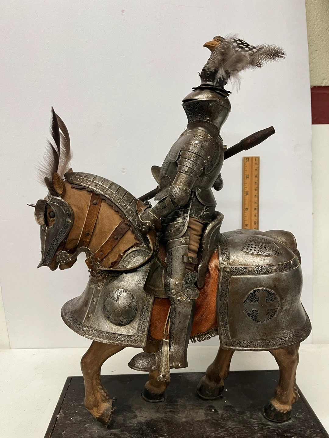 This is a vintage figure of a knight in full armor riding a wooden horse. The detailing on the armor is intricate, with feathers adorning the knight's helmet and the horse's head. It's mounted on a wooden base for display. A fantastic piece for collectors!