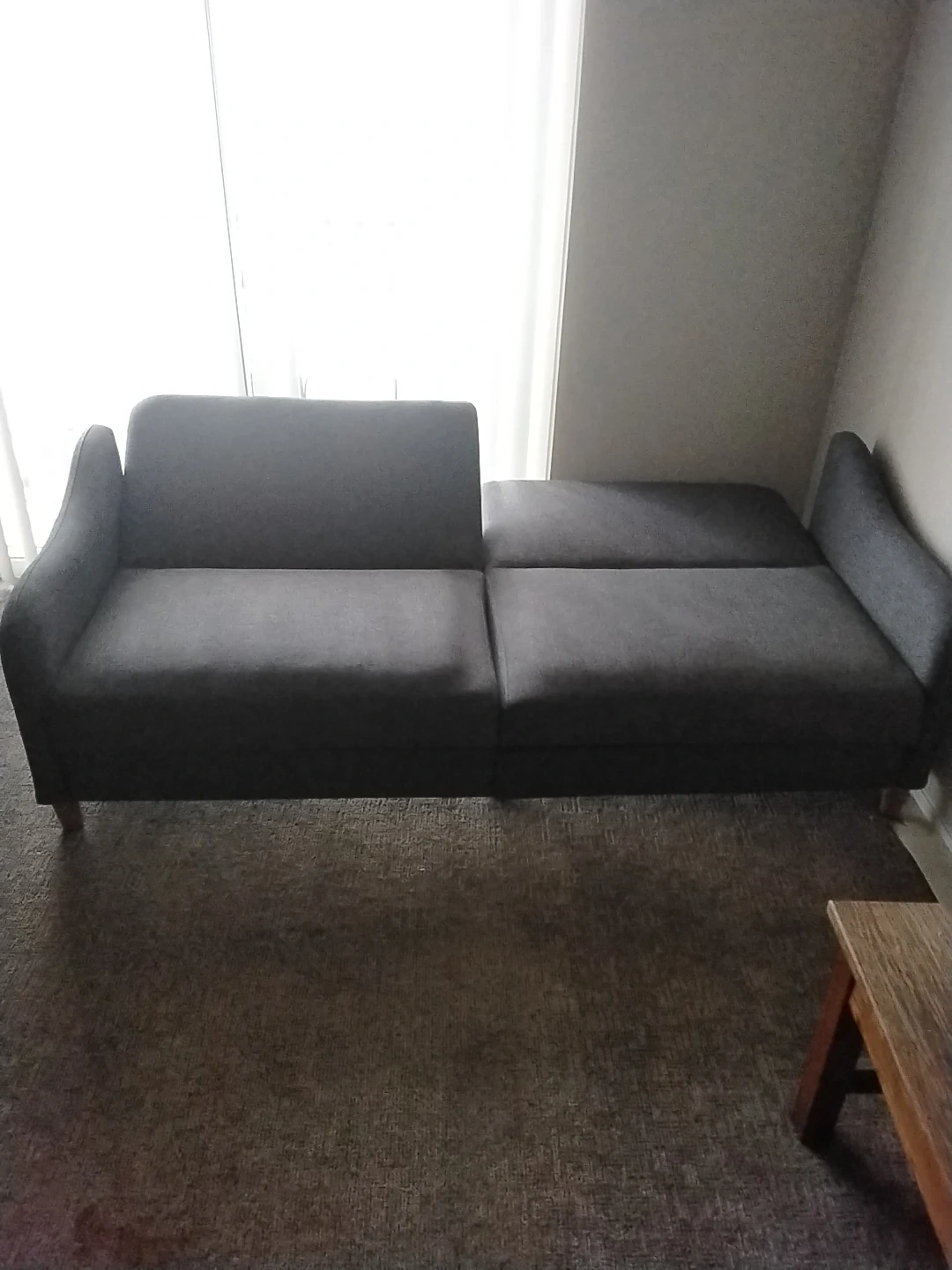 This is a dark grey sofa couch with a modern design. It has clean lines and wooden legs. The couch appears to be a sleeper sofa, with a fold-out bed configuration visible in one of the images.