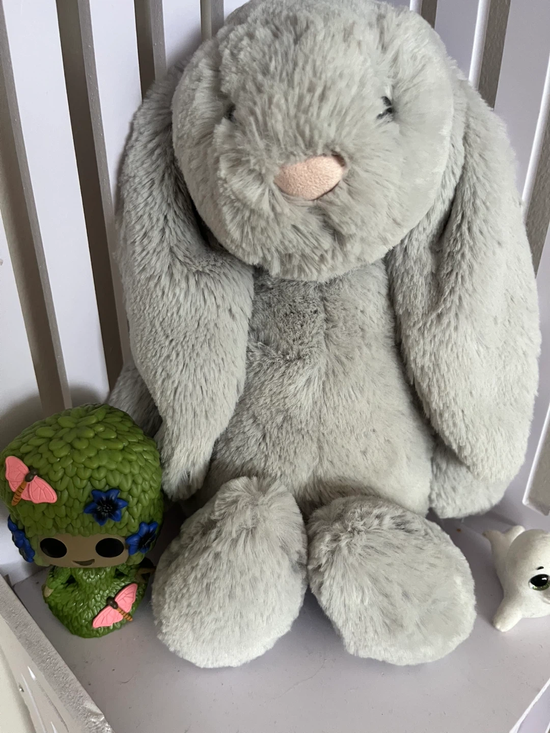 This is a Jellycat Bashful bunny plush toy in a soft grey colour. It's super cuddly and a great size for little hands. Perfect for snuggles!
