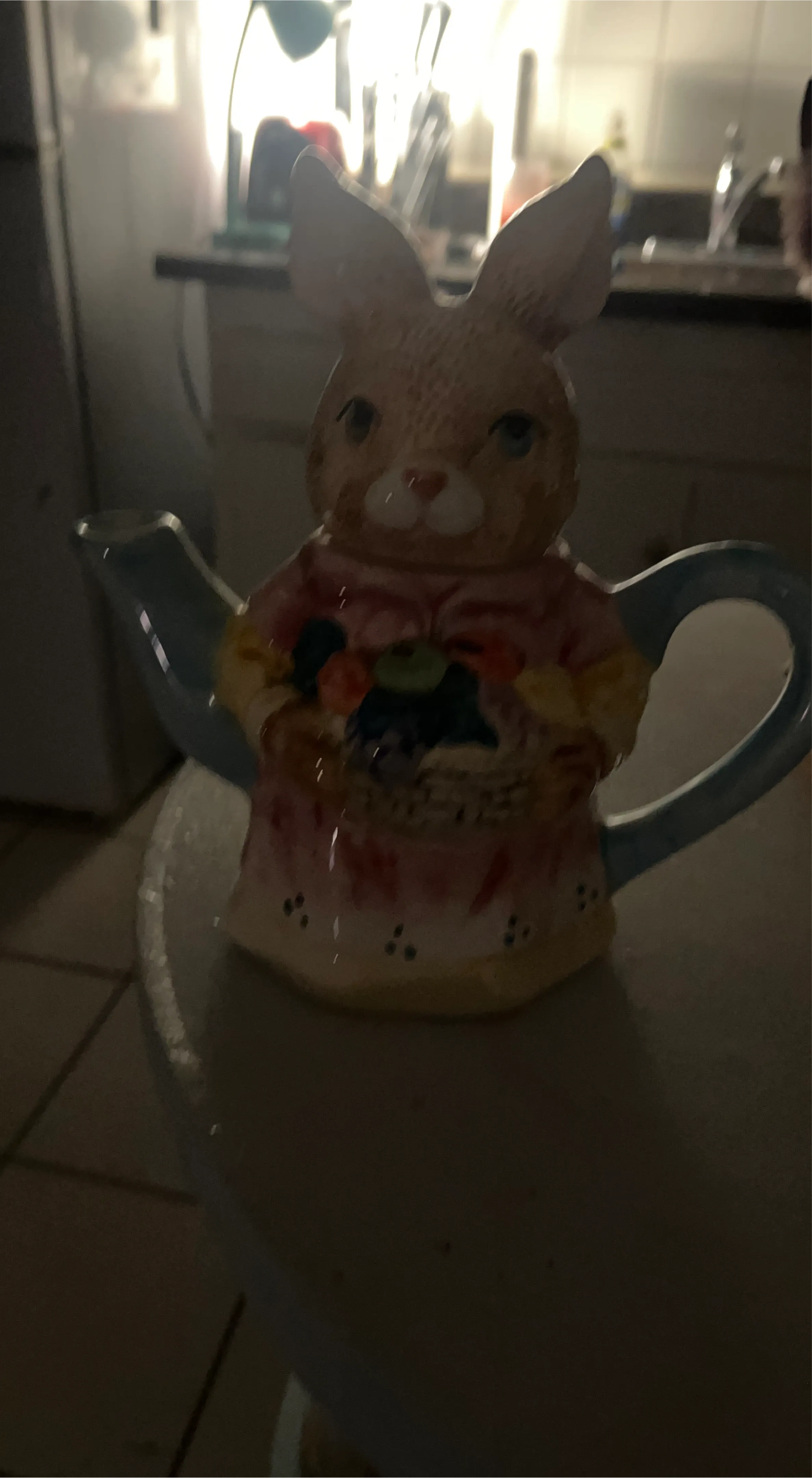 Ceramic teapot shaped like a bunny rabbit. It's wearing a pink dress and holding a basket of fruit. The teapot has a light blue handle and spout. A fun decorative piece for your kitchen!