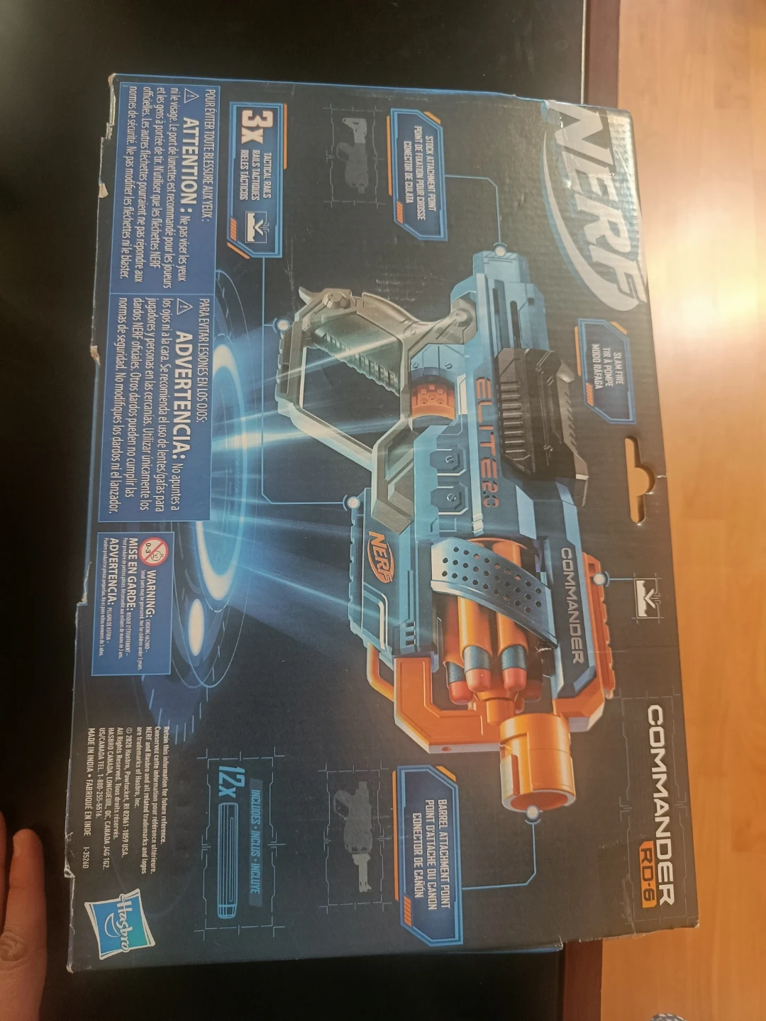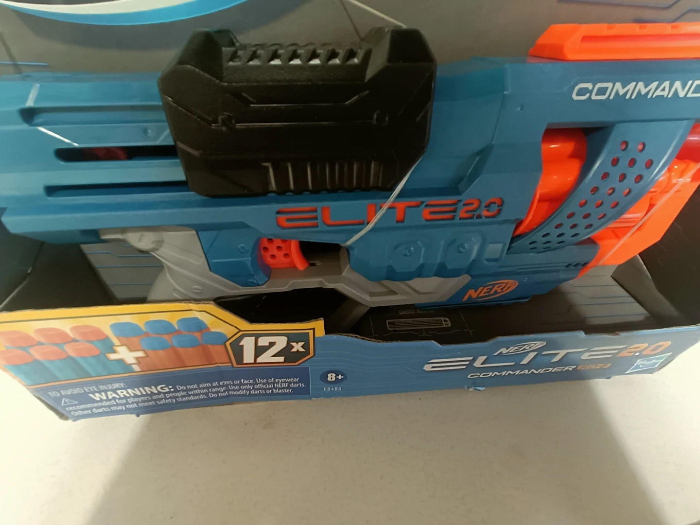 This Nerf Elite 2.0 Commander RD-6 blaster comes with a 12-dart capacity. It features a rotating dart drum and a removable barrel attachment. Suitable for ages 8 and up.