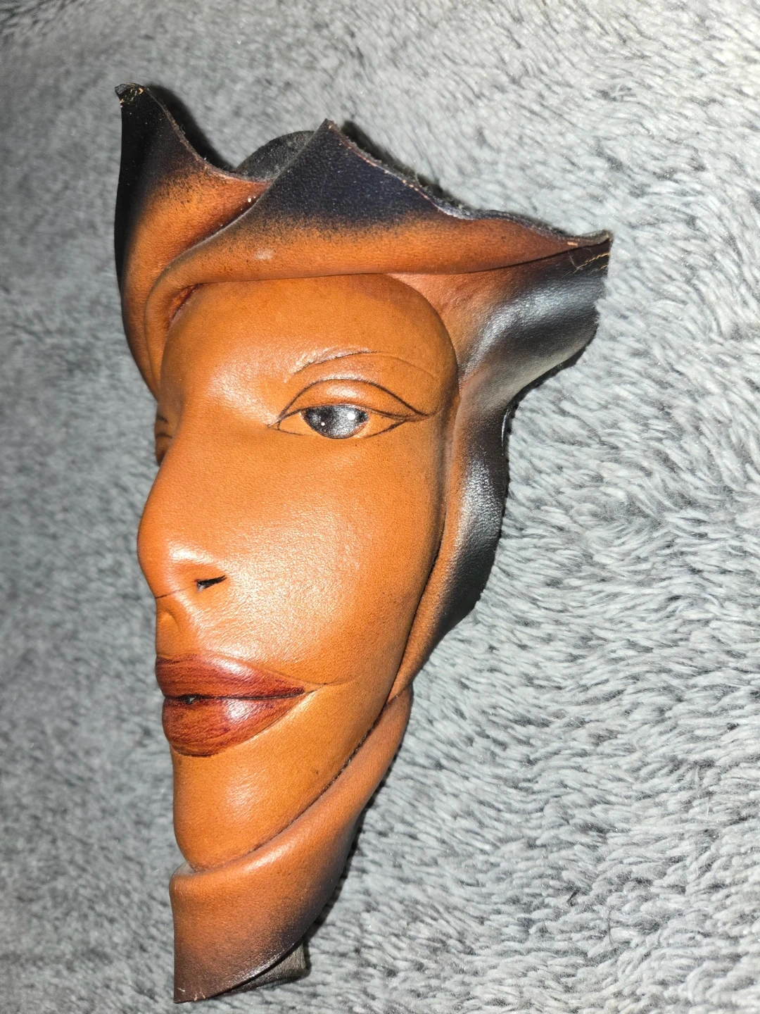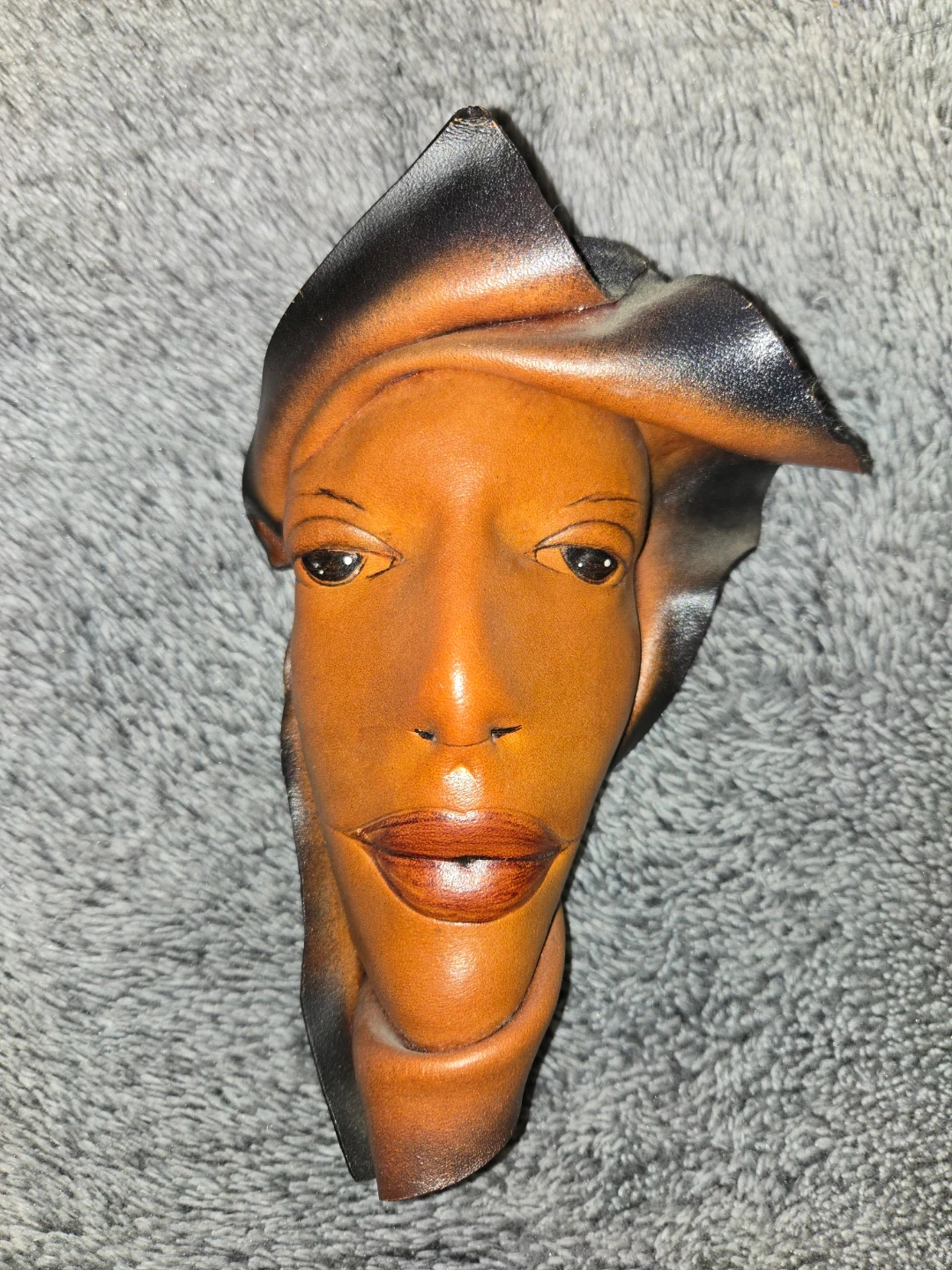 Rare Unique Vintage Doug Gibson 86' Hand Crafted Sculpted Leather Wall Art Lady with Hat handcrafted leather mask. Features a stylized face. Brown and dark brown tones. Could be a wall hanging or decorative accent.