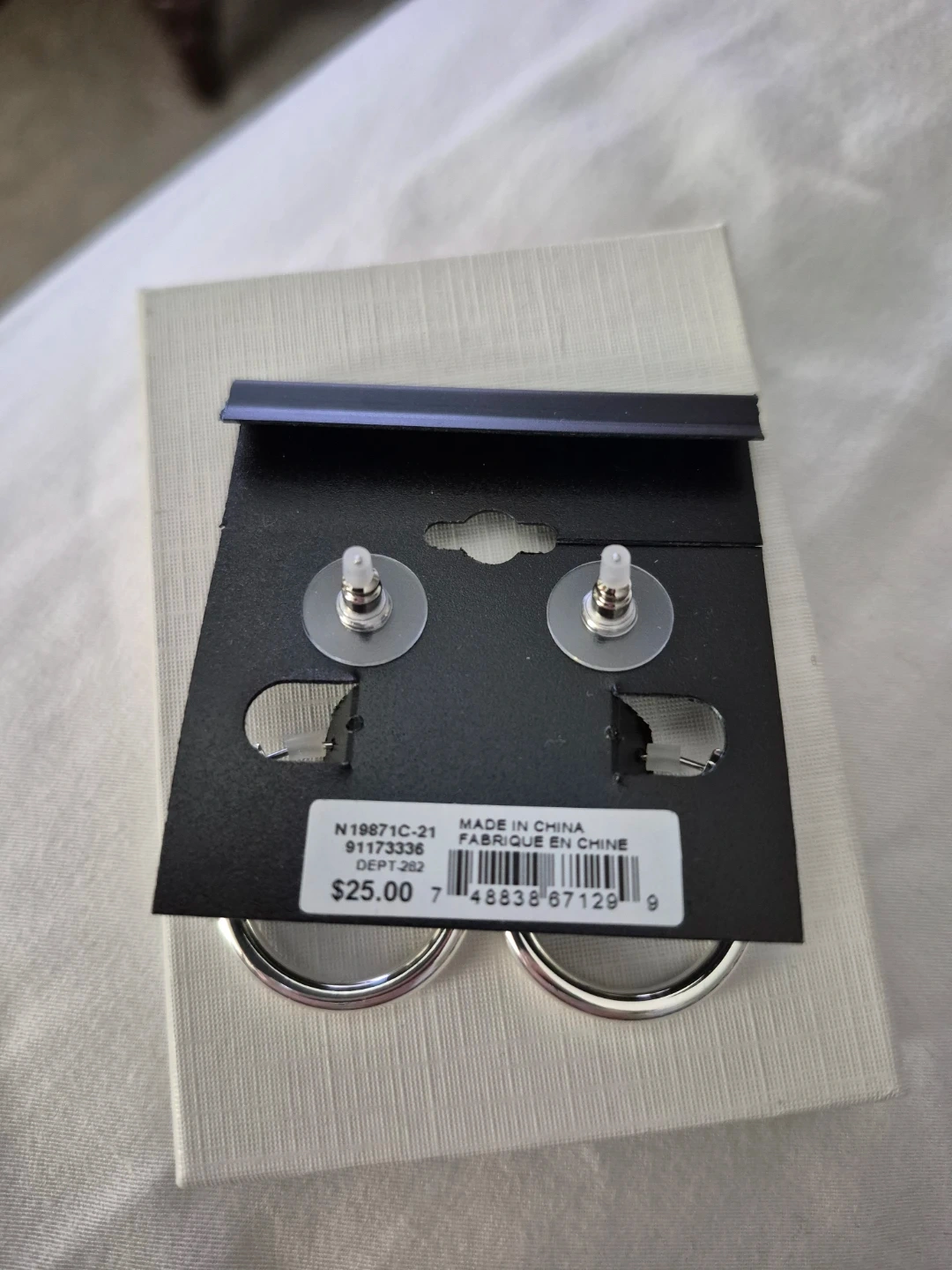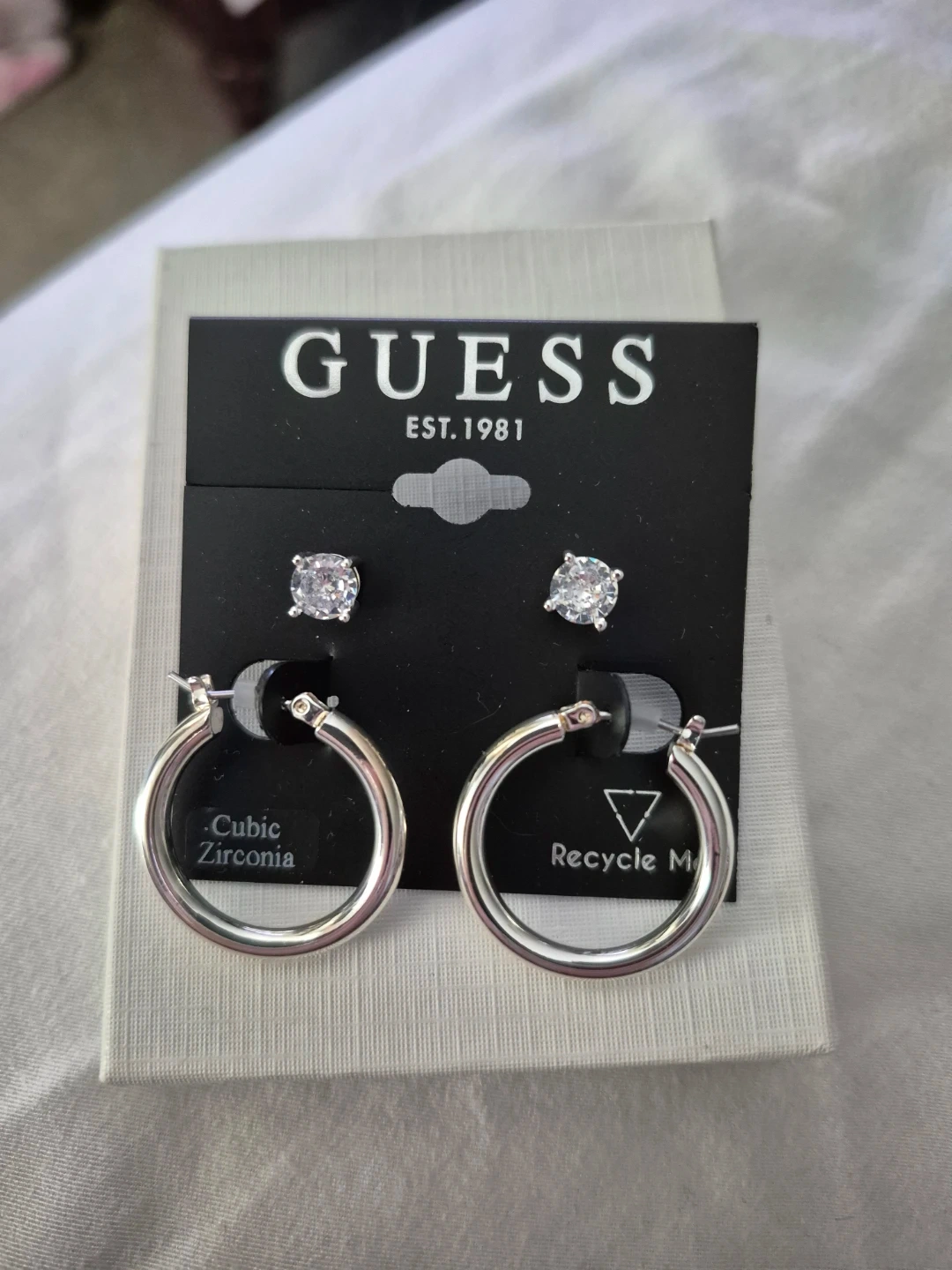 This Guess earring set includes a pair of hoop earrings and a pair of stud earrings. Both are silver-toned and feature cubic zirconia. Perfect for adding a touch of sparkle to any outfit!