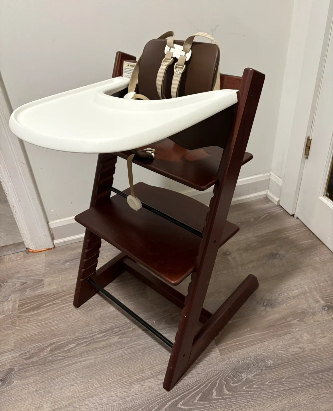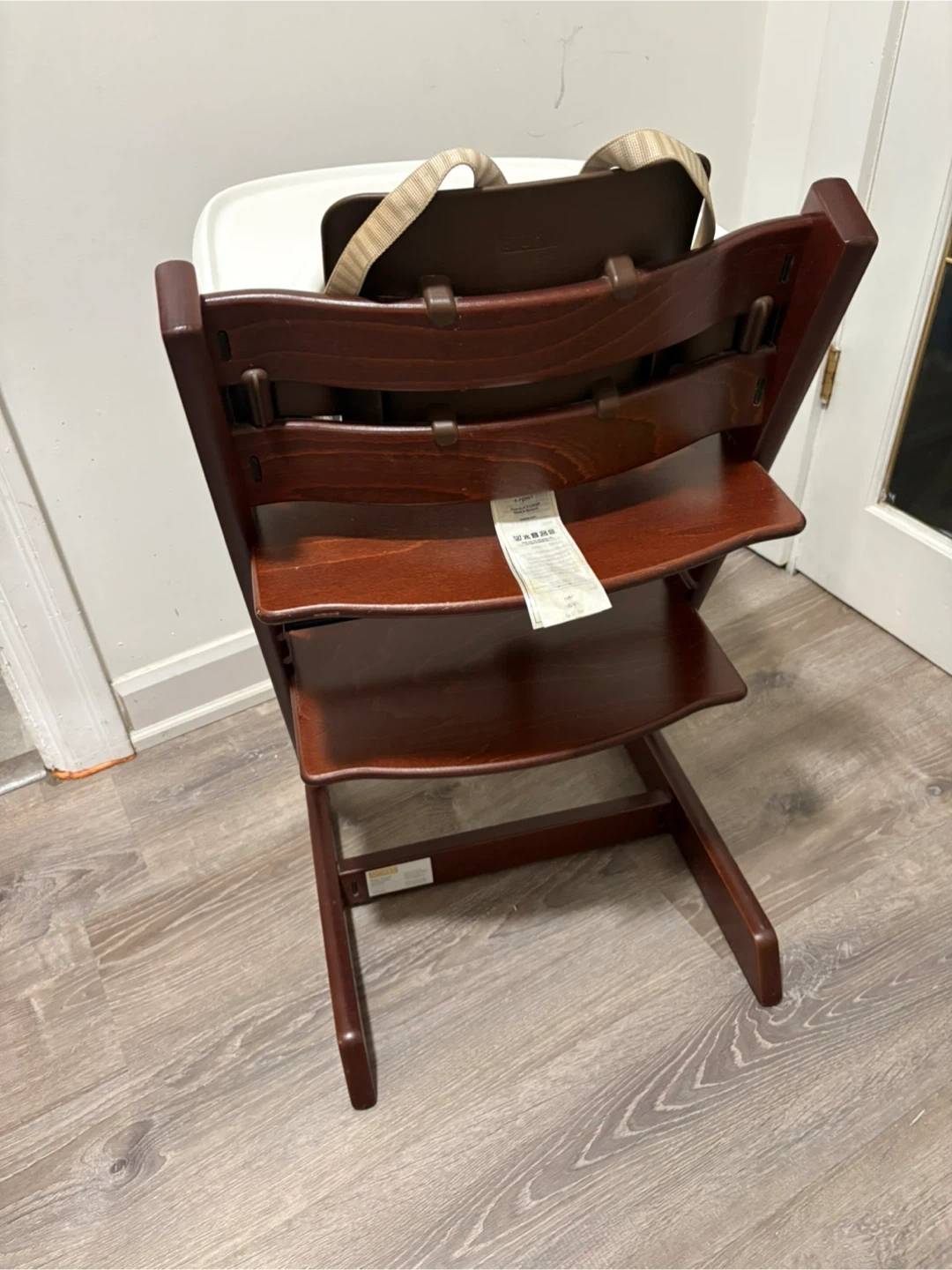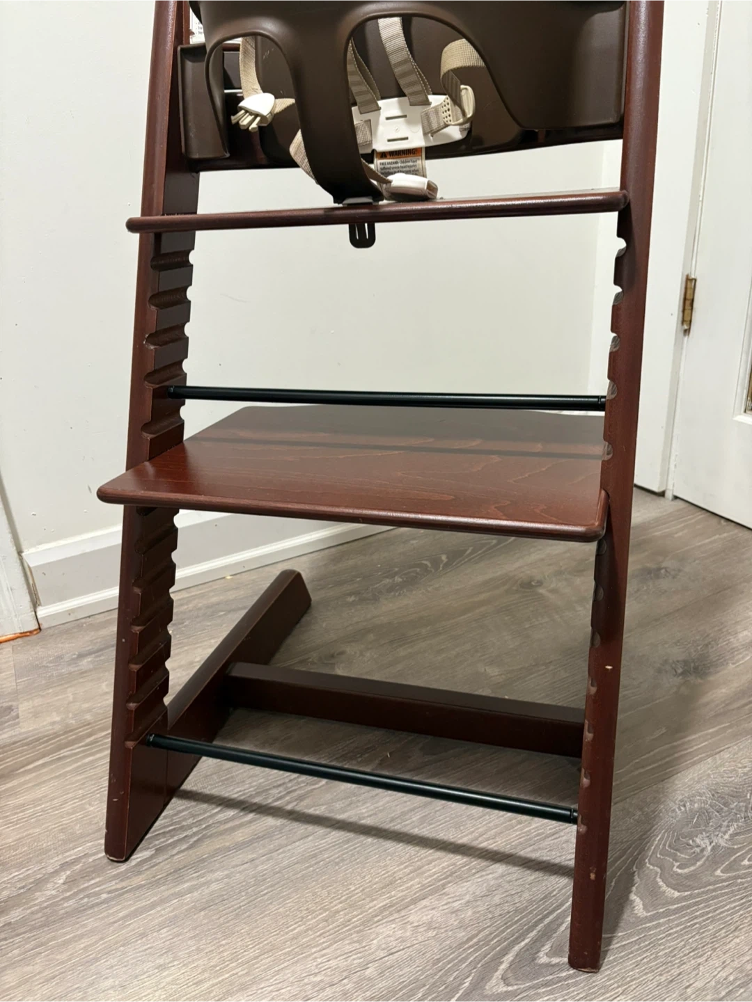 Stokke Tripp Trapp high chair in a dark brown wood finish.