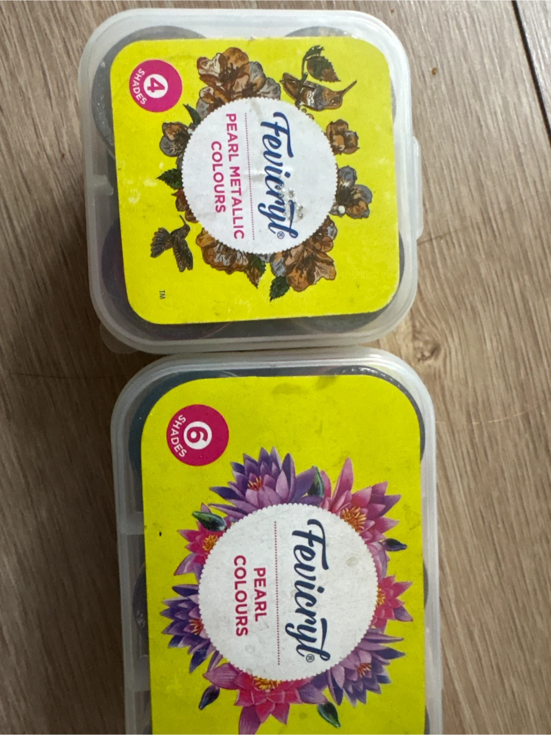 This set includes Fevicryl Pearl Colours in 4 shades and Fevicryl Pearl Metallic Colours in 6 shades. These are acrylic paints with a pearlescent finish. Great for adding a shimmering touch to crafts and art projects!