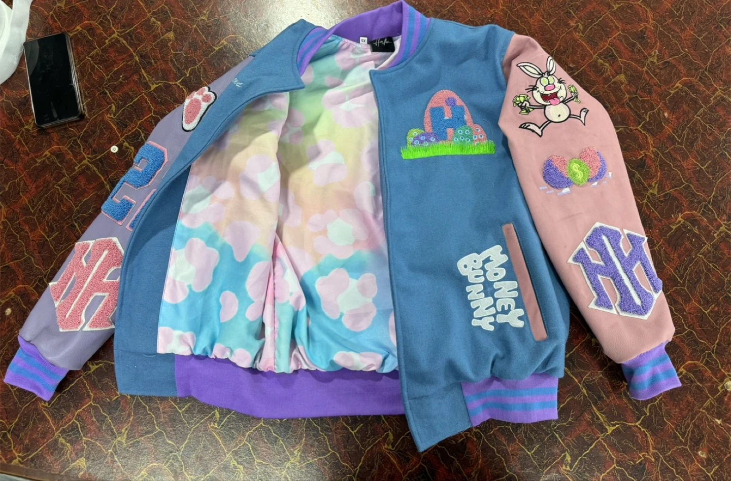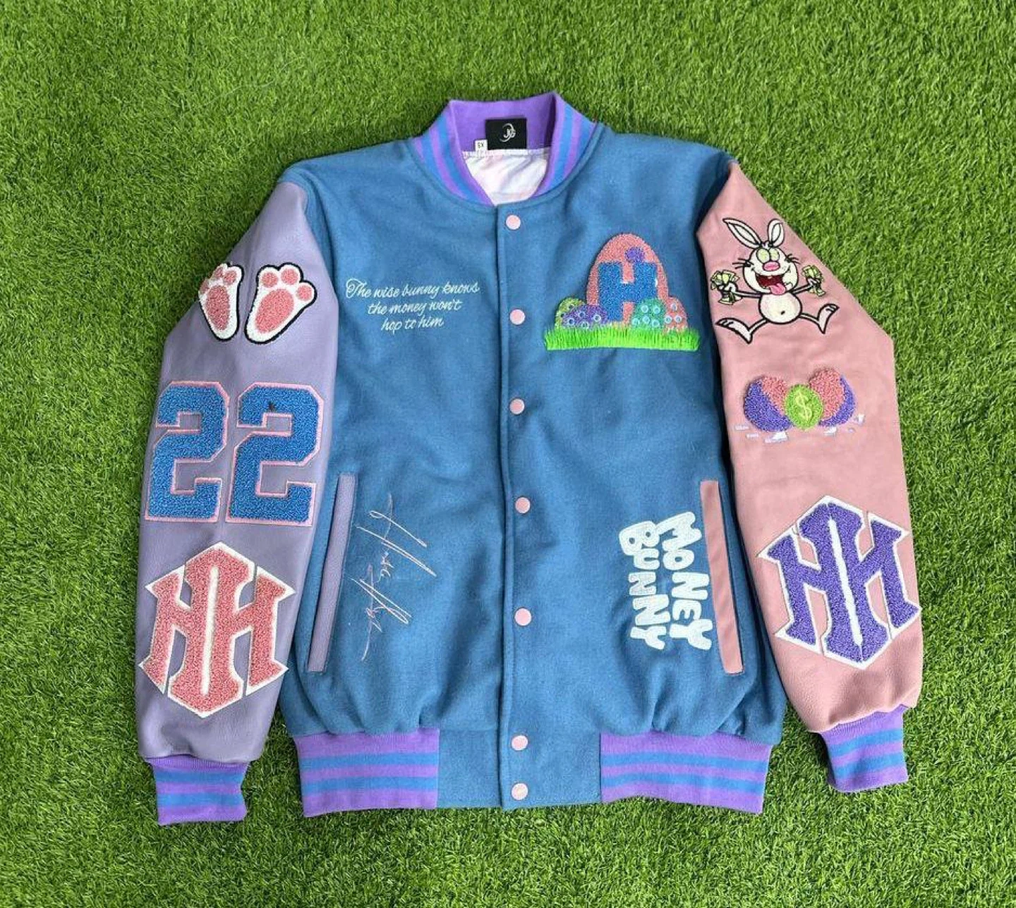 Blue and pink letterman jacket with embroidered bunny graphic and 'Money Bunny' text. Features contrast sleeves with '22' and monogram detailing. Fully lined with a colorful pattern.