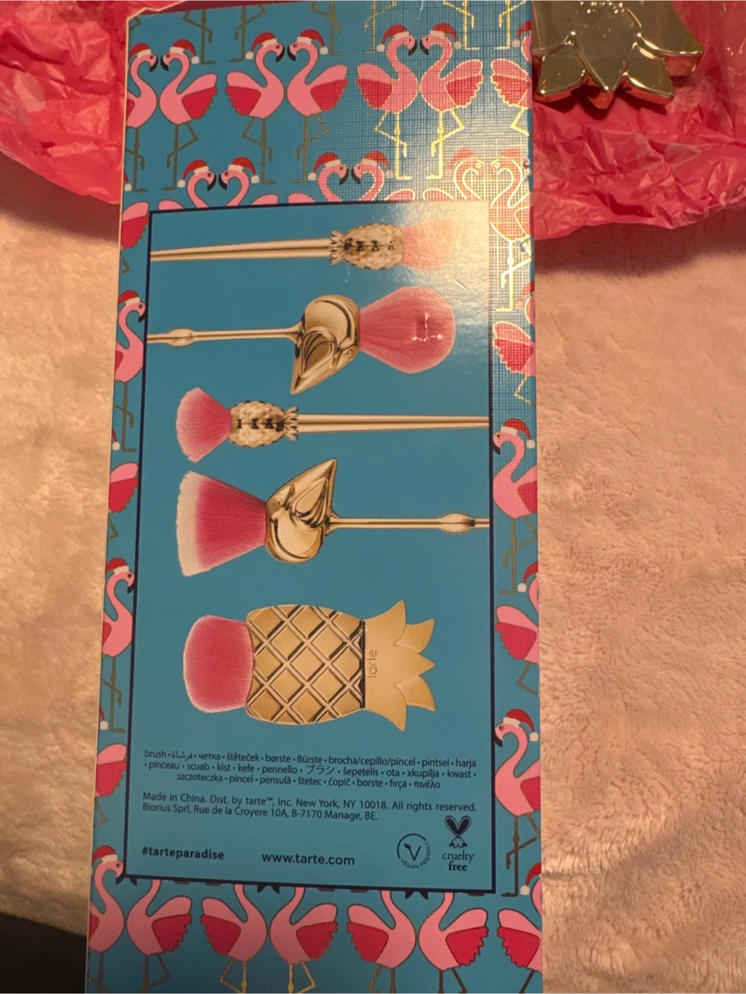 This Tarte makeup brush set features unique pineapple and flamingo designs. It includes several brushes with pink bristles and gold handles. Perfect for adding a fun touch to your makeup routine!