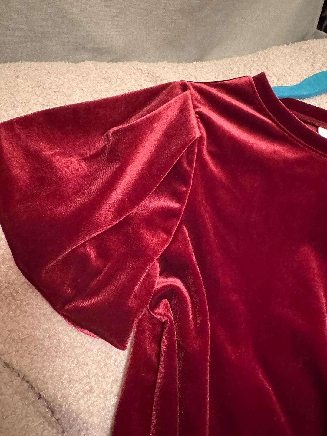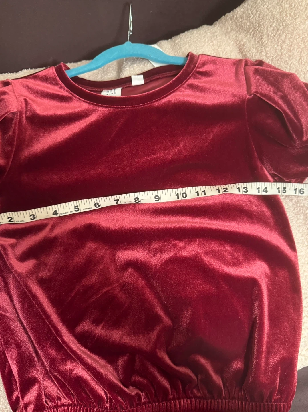Burgundy velvet top. Puff sleeves. Elastic waistband. Size Medium (8). New with tags.