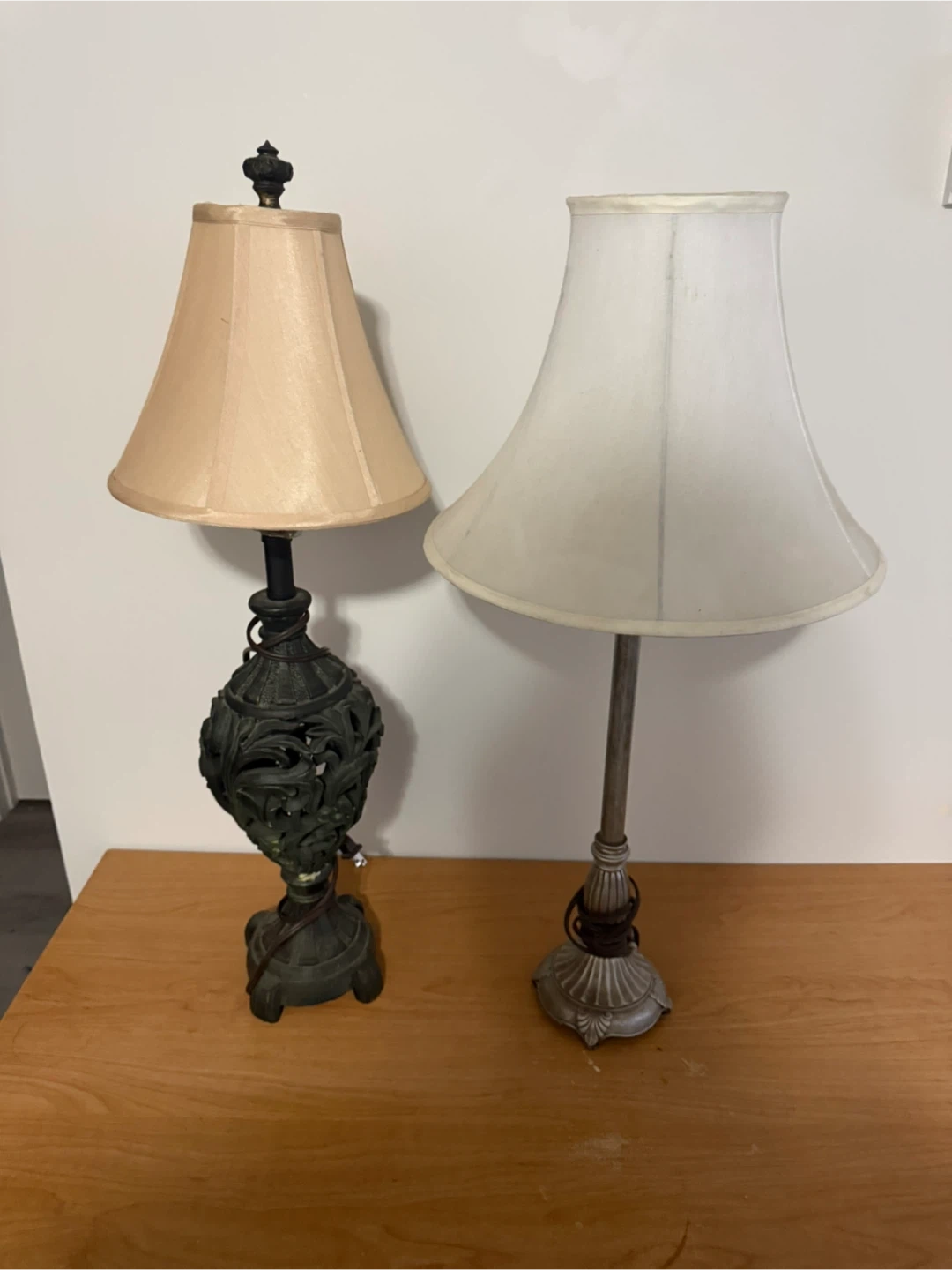Selling two table lamps. One has a beige shade and an ornate, dark-coloured base. The other has a white shade and a silver-coloured base. They would look great in any room!