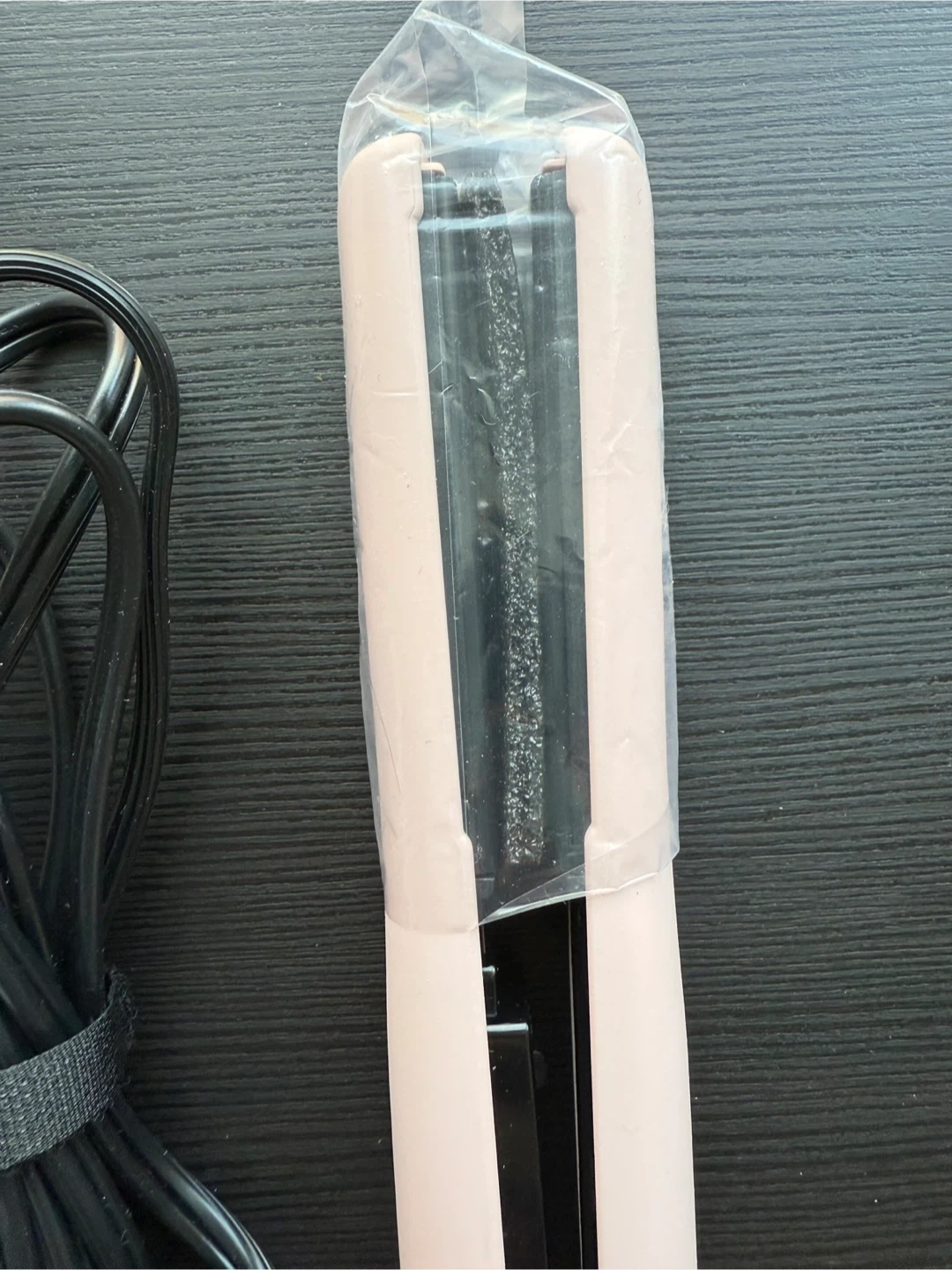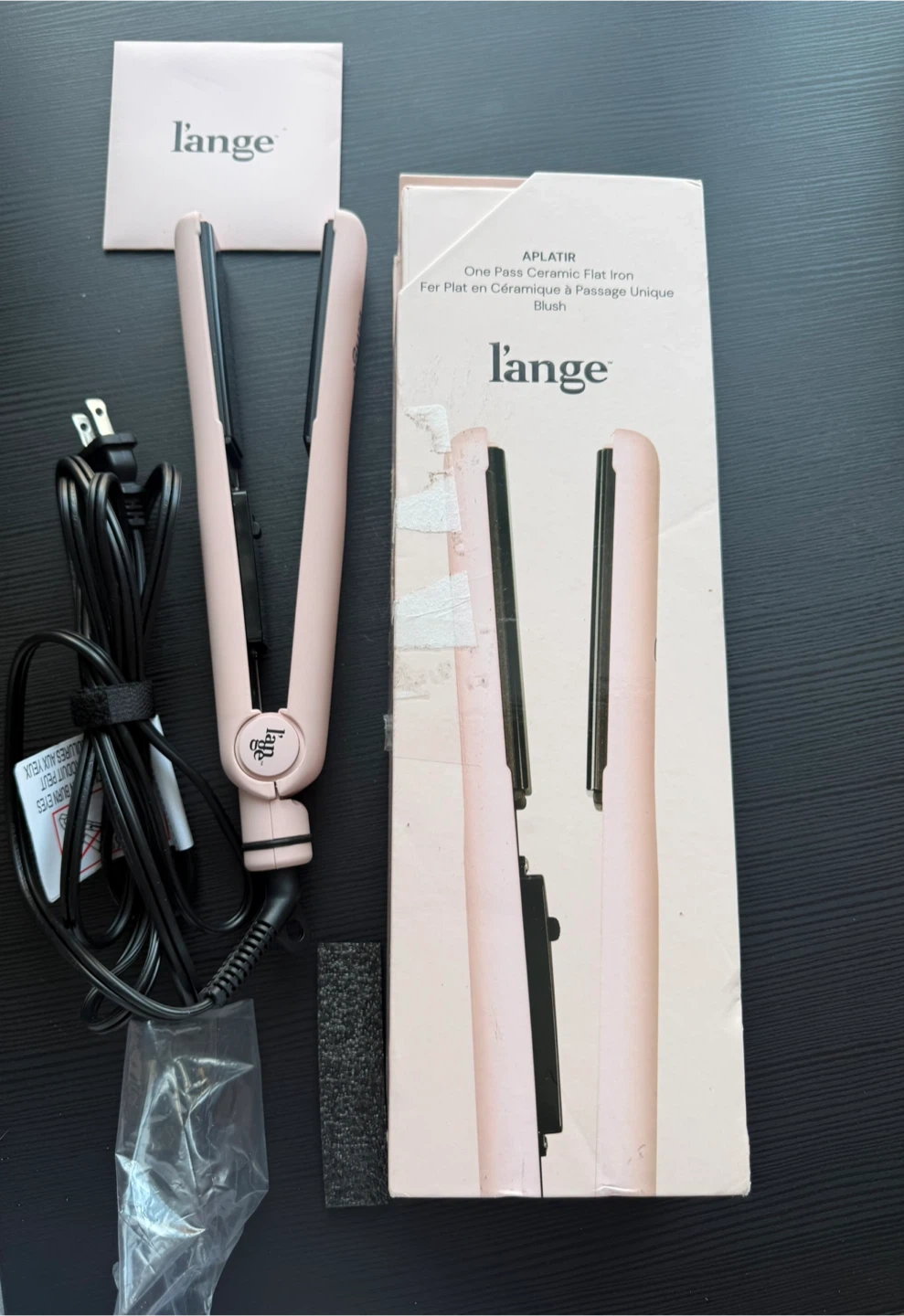 This is a L'ange APLTIR one pass ceramic flat iron in blush. It's 10.23 inches long. Ceramic plates help style hair smoothly.
