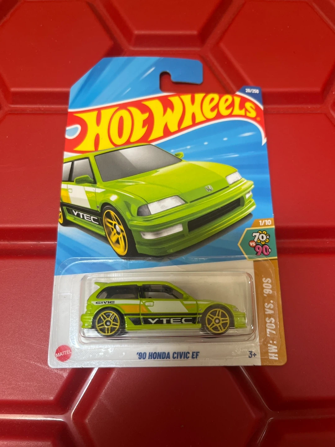 Hot Wheels '90 Honda Civic EF die-cast car. This is a 1/10 scale model. It's part of the HW: '70s vs. '90s series. Suitable for ages 3 and up!
