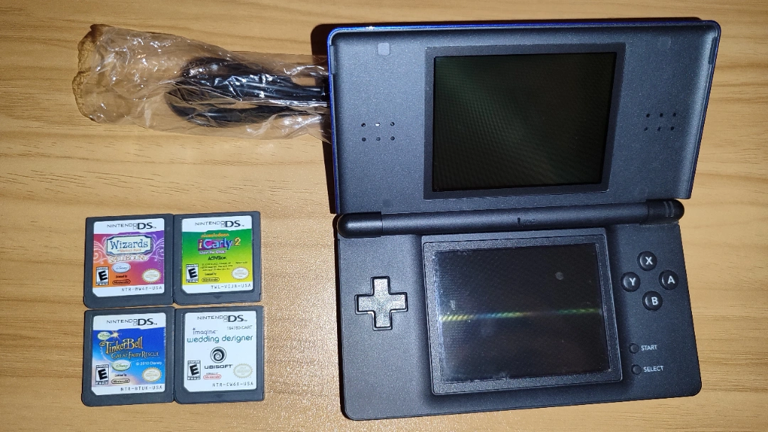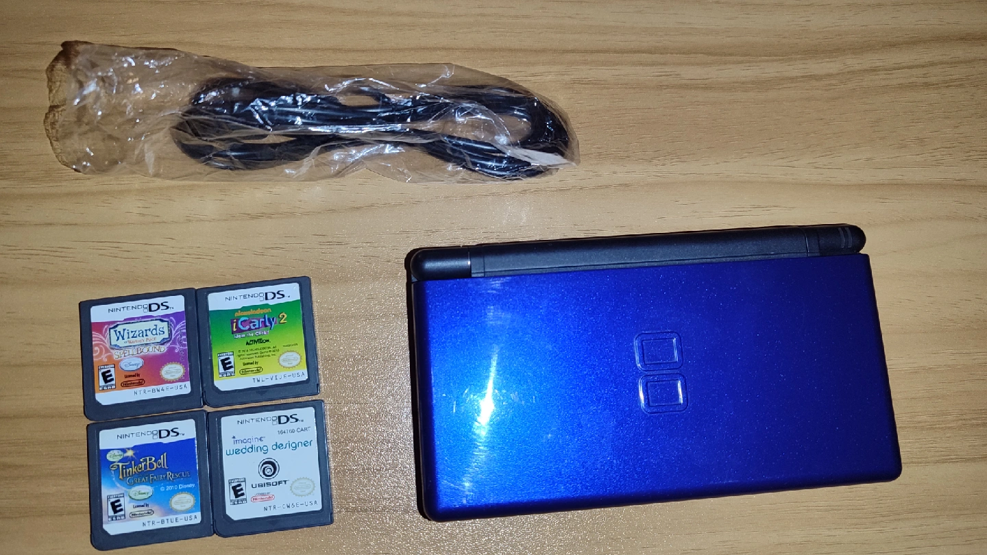 Selling a Nintendo DS Lite in blue. Comes with a charger and four games: Wizards of Waverly Place, iCarly 2, Tinker Bell: Lost Treasure, and Imagine Wedding Designer