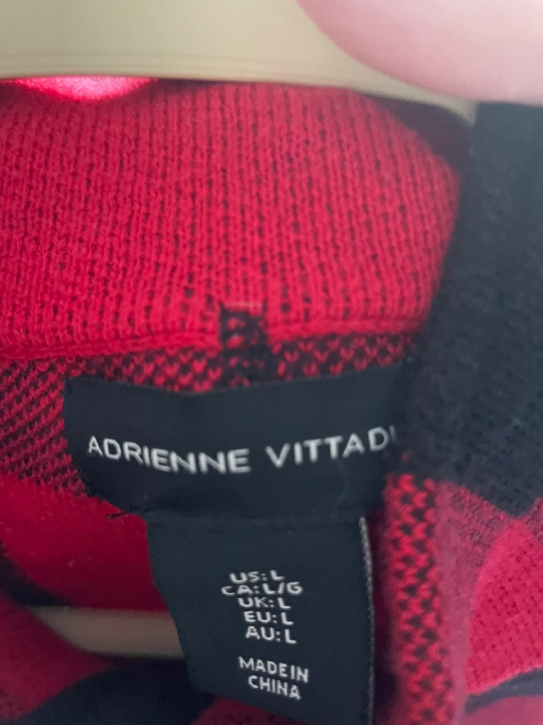 This Adrienne Vittadini jacket features a red and black buffalo plaid pattern. It's a zip-up style with a stand-up collar. Size is large. Long but not bulky. Pockets. A nice lightweight sweater jacket. Good used condition.