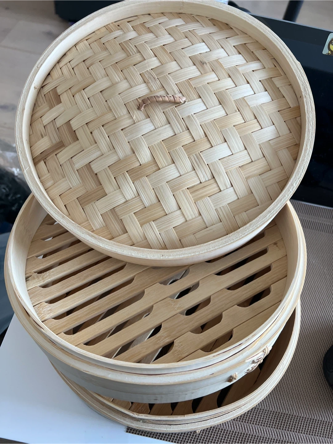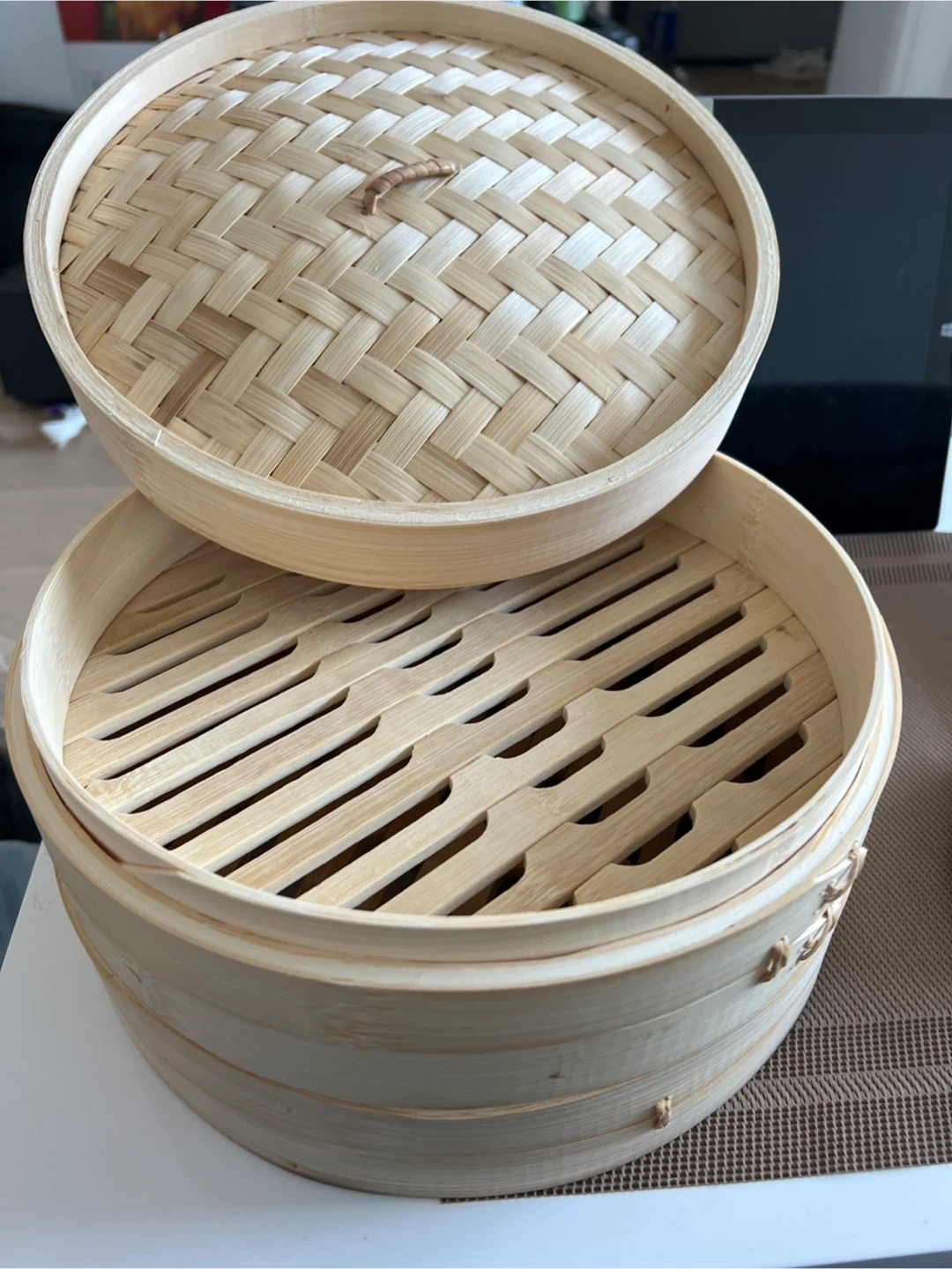 A set of bamboo steamer baskets with a lid. These are great for steaming vegetables, dumplings, and more. Made from natural bamboo.