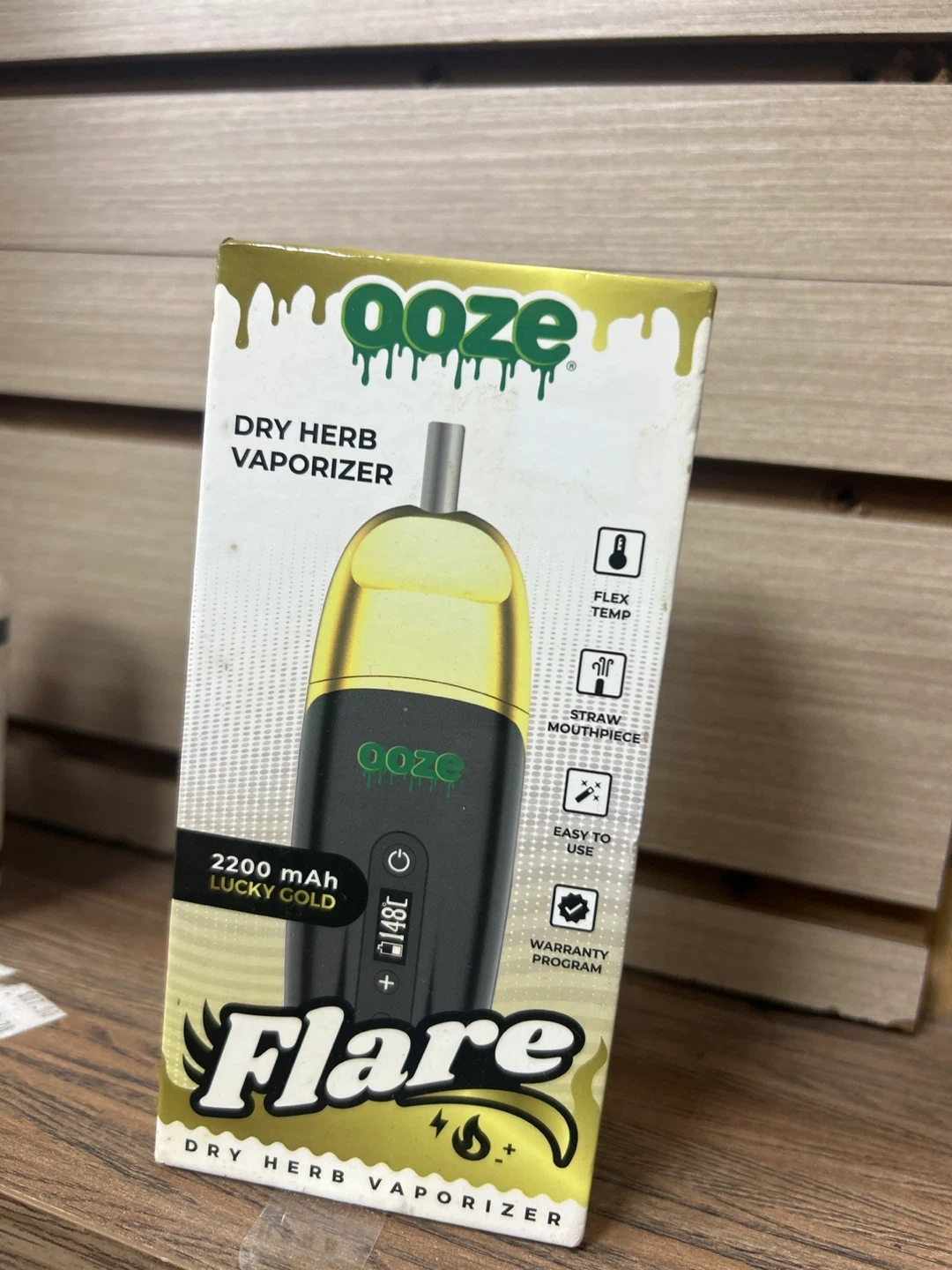 Selling an Ooze Flare dry herb vaporizer. It features flex temp, a straw mouthpiece, and is easy to use. It also has a warranty program. The vaporizer has a 2200 mAh battery and comes in a lucky gold color