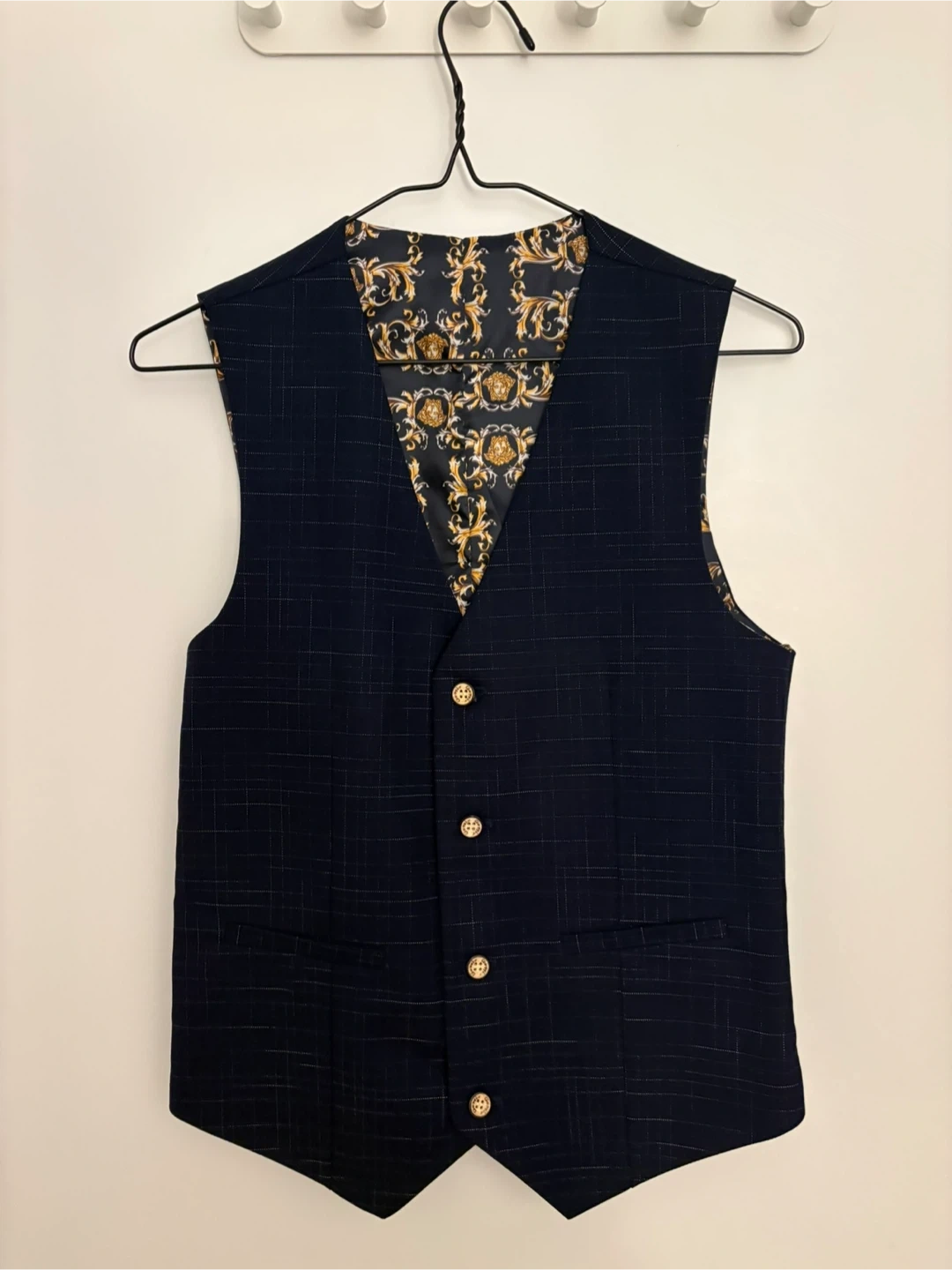 This navy blue vest features a subtle plaid pattern and a striking ornate gold and black lining. It has four gold-toned buttons at the front and an adjustable strap at the back. It's perfect for layering over a dress shirt for a polished look.