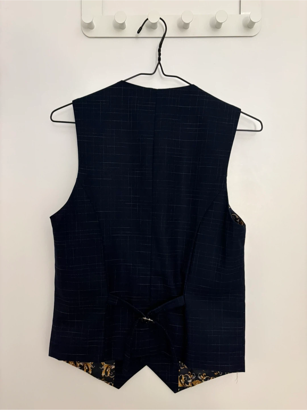 This navy blue vest features a subtle plaid pattern and a striking ornate gold and black lining. It has four gold-toned buttons at the front and an adjustable strap at the back. It's perfect for layering over a dress shirt for a polished look.