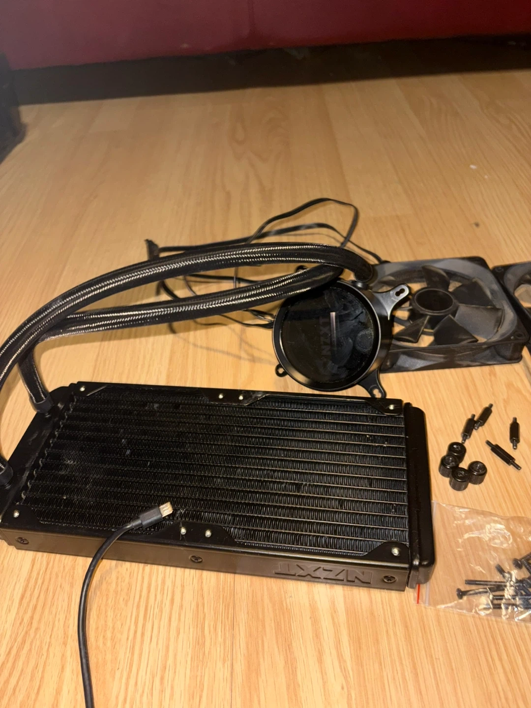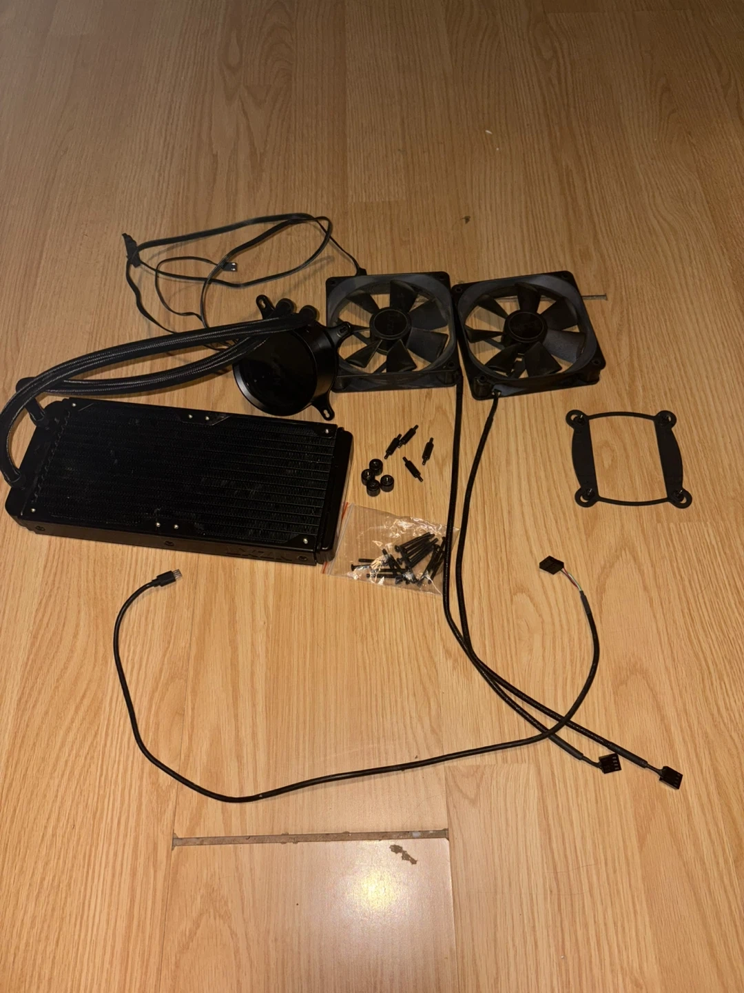 This is an NZXT Kraken X53 all-in-one liquid cooler. It includes two 120mm fans and all necessary mounting hardware. This cooler is black and has RGB lighting capabilities. It's great for keeping your CPU temps low!