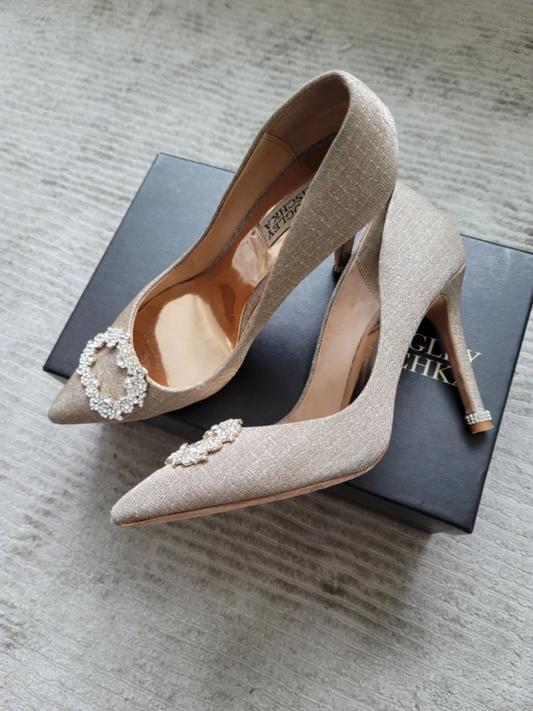 Selling a pair of Badgley Mischka Nichole II heels in size 8.5. These stylish heels come with their original box. They feature a beautiful embellishment on the toe, adding a touch of elegance to any outfit. Perfect for special occasions or adding a bit of sparkle to your everyday look!