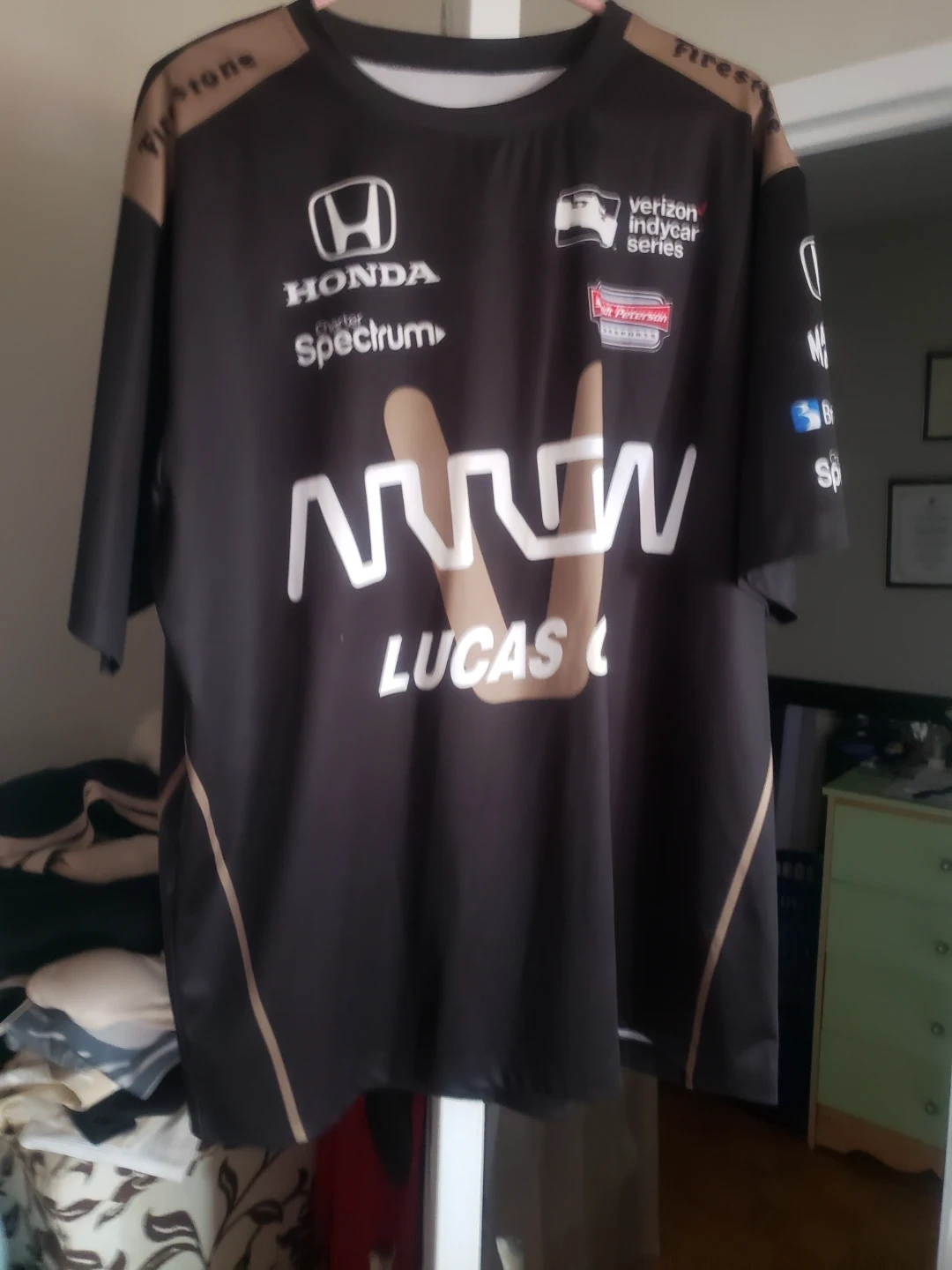 This is a Honda Hinch 5 Verizon IndyCar Series t-shirt. It's black with gold accents and features multiple sponsor logos. Made for race fans!