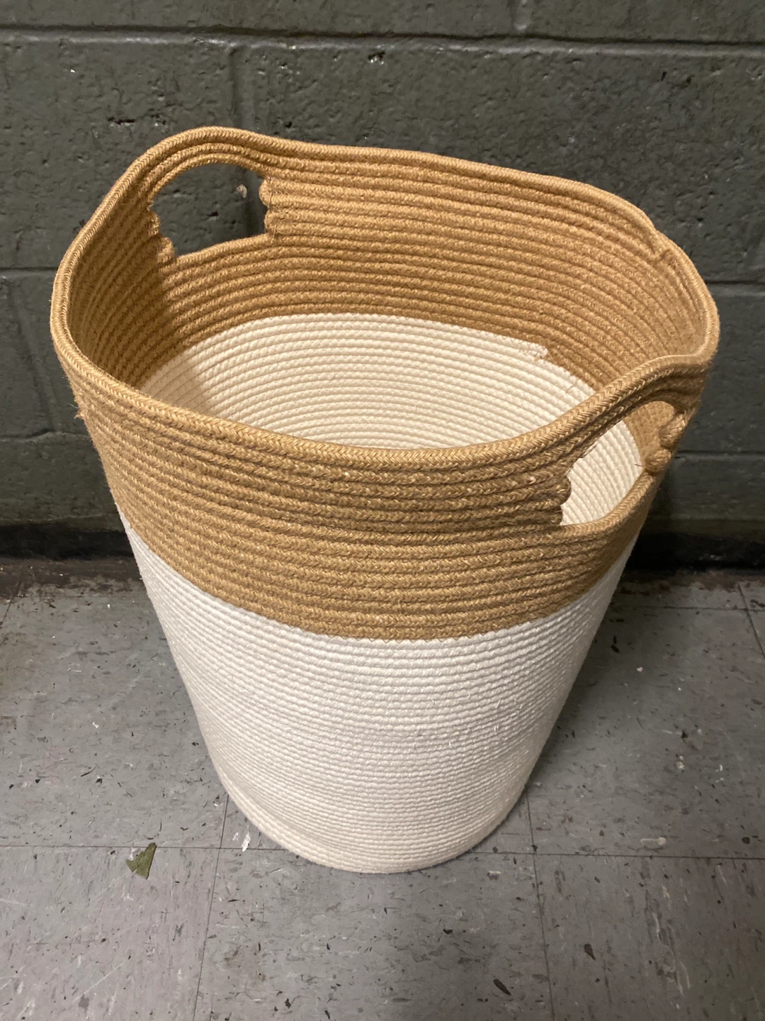 This is a stylish woven storage basket. It's made from rope and features integrated handles for easy carrying. The bottom half is white, and the top half is a natural tan color.