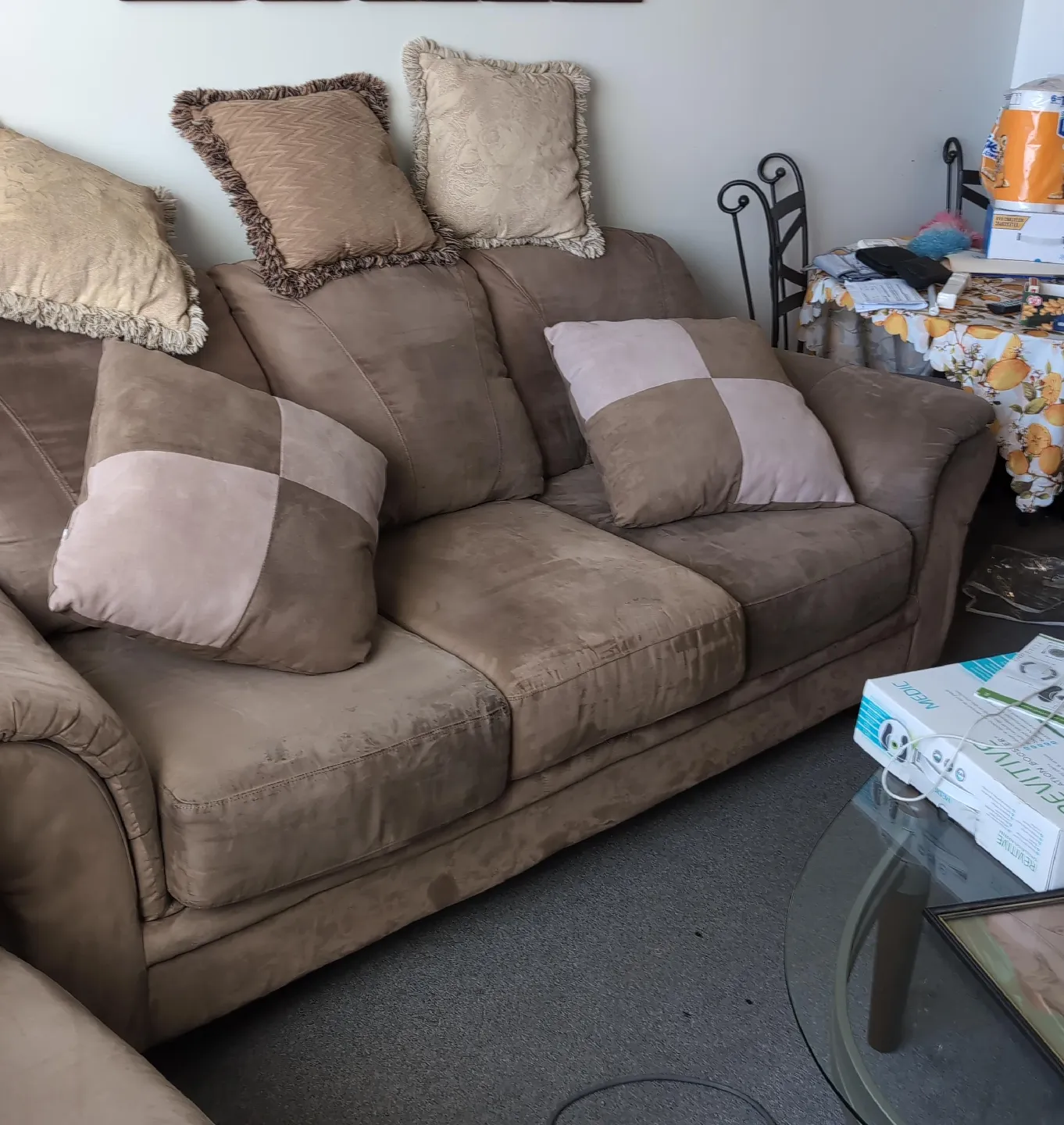 Selling a comfy brown sofa! It's in good condition and perfect for a living room or den. It has a classic design and comes with some decorative pillows to match. Great for relaxing and adding a cozy touch to your home