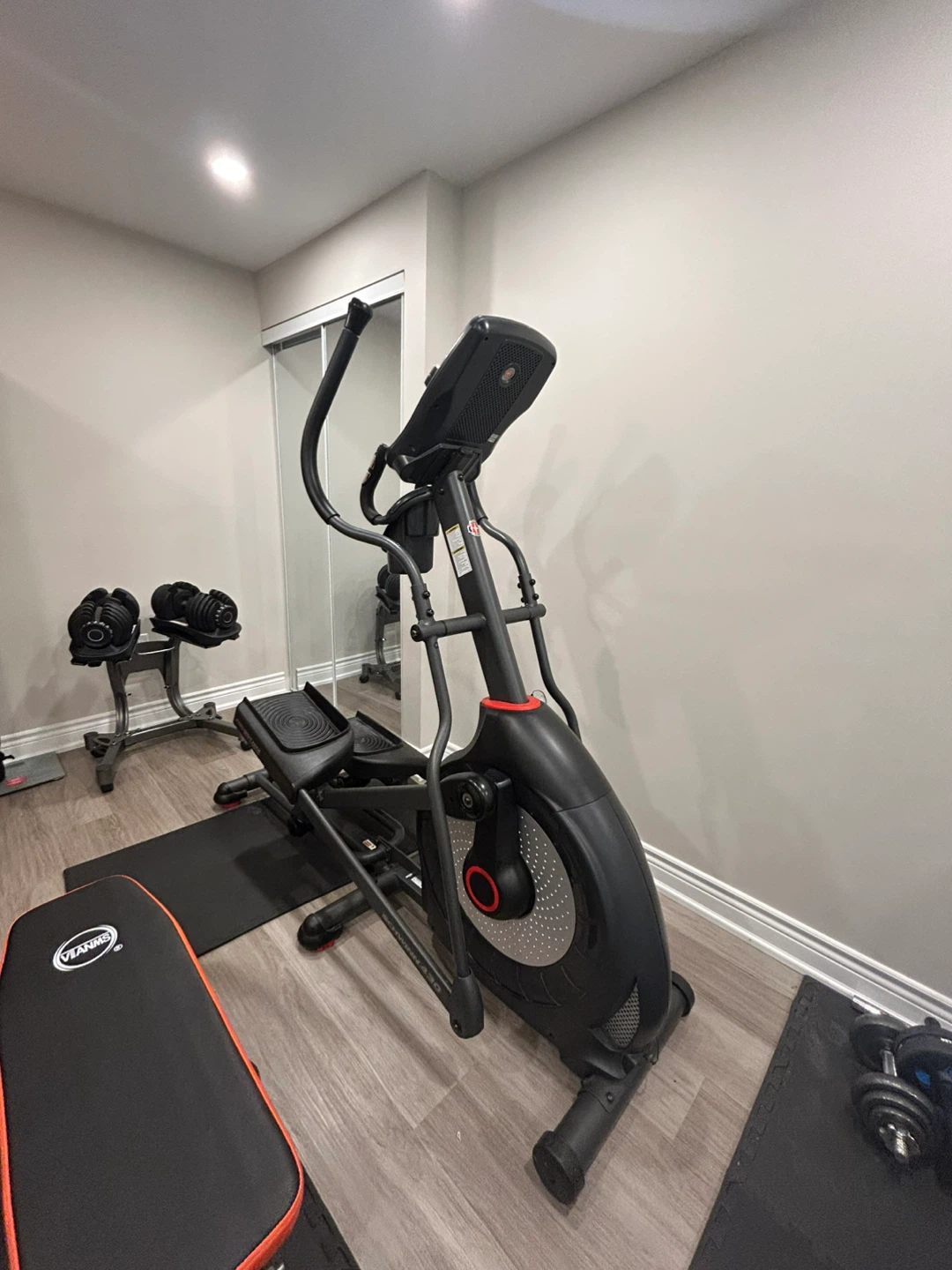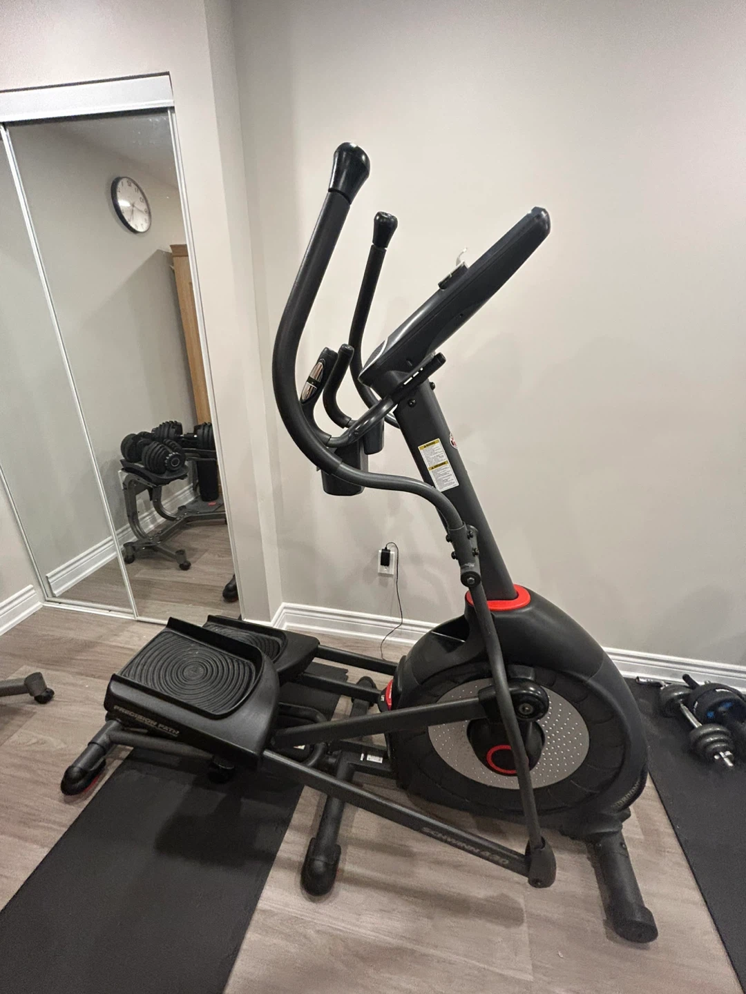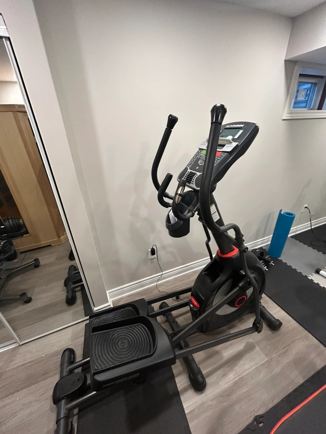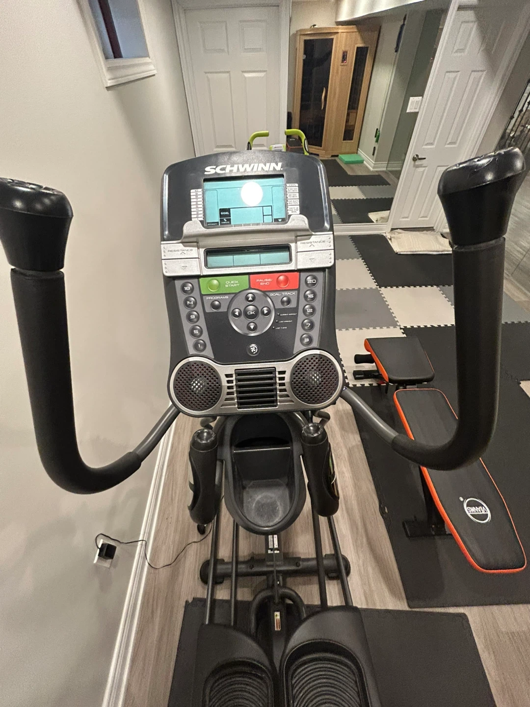This Schwinn elliptical machine is in good working condition. It features a console with various programs and readings for your workouts. Foot pedals are textured for grip.
