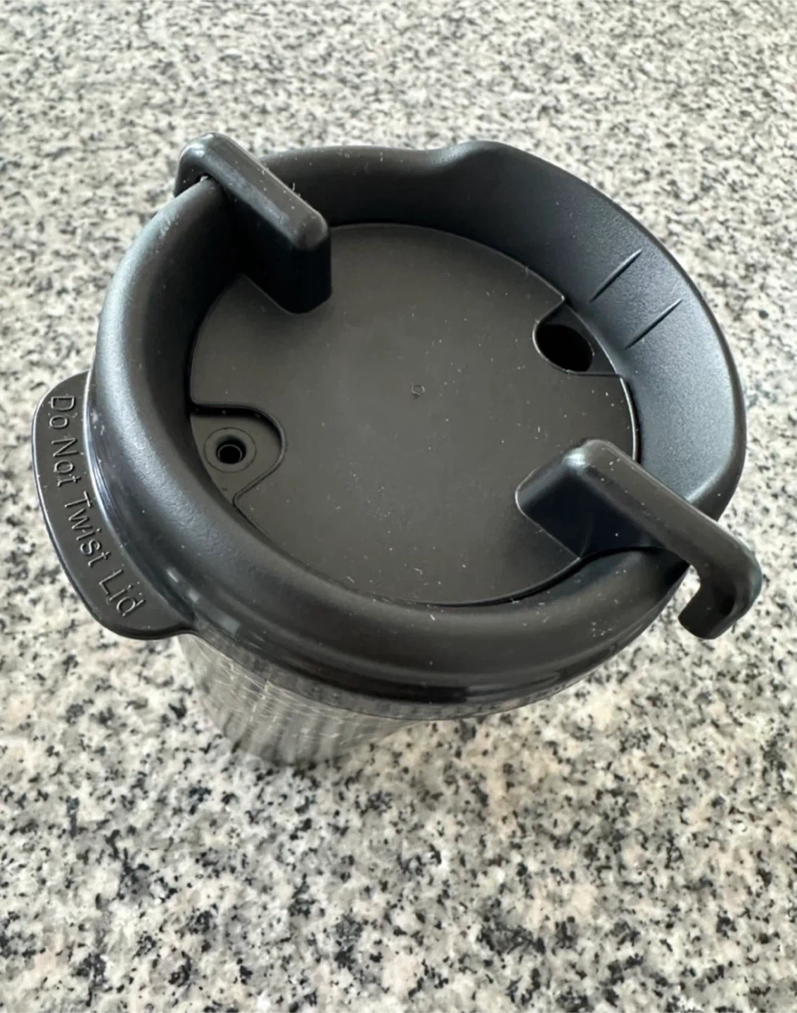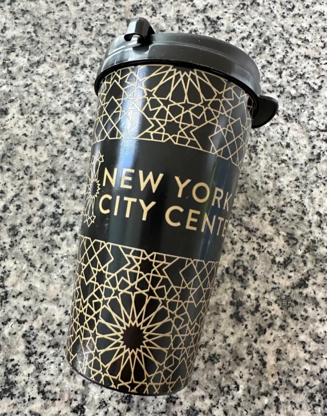 This is a black travel tumbler with a gold geometric pattern. It features the "NEW YORK CITY CENTER" text. The lid is black with a flip-top closure. Do not twist lid.