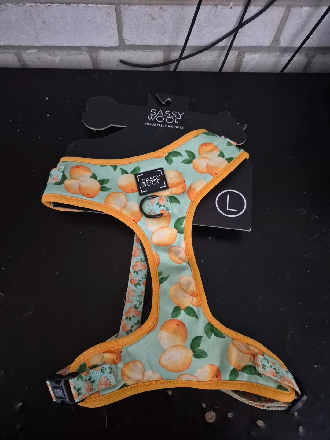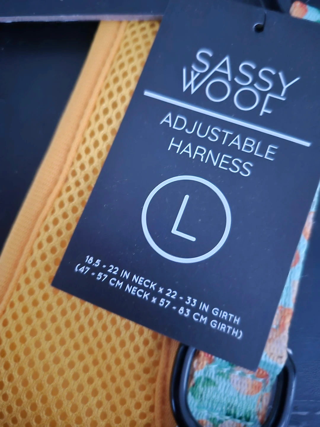 This Sassy Woof adjustable harness features a cute peach print. It's designed for a neck size of 16.5-22 inches and a girth of 22-33 inches. It offers three adjustment slides for a final fit.