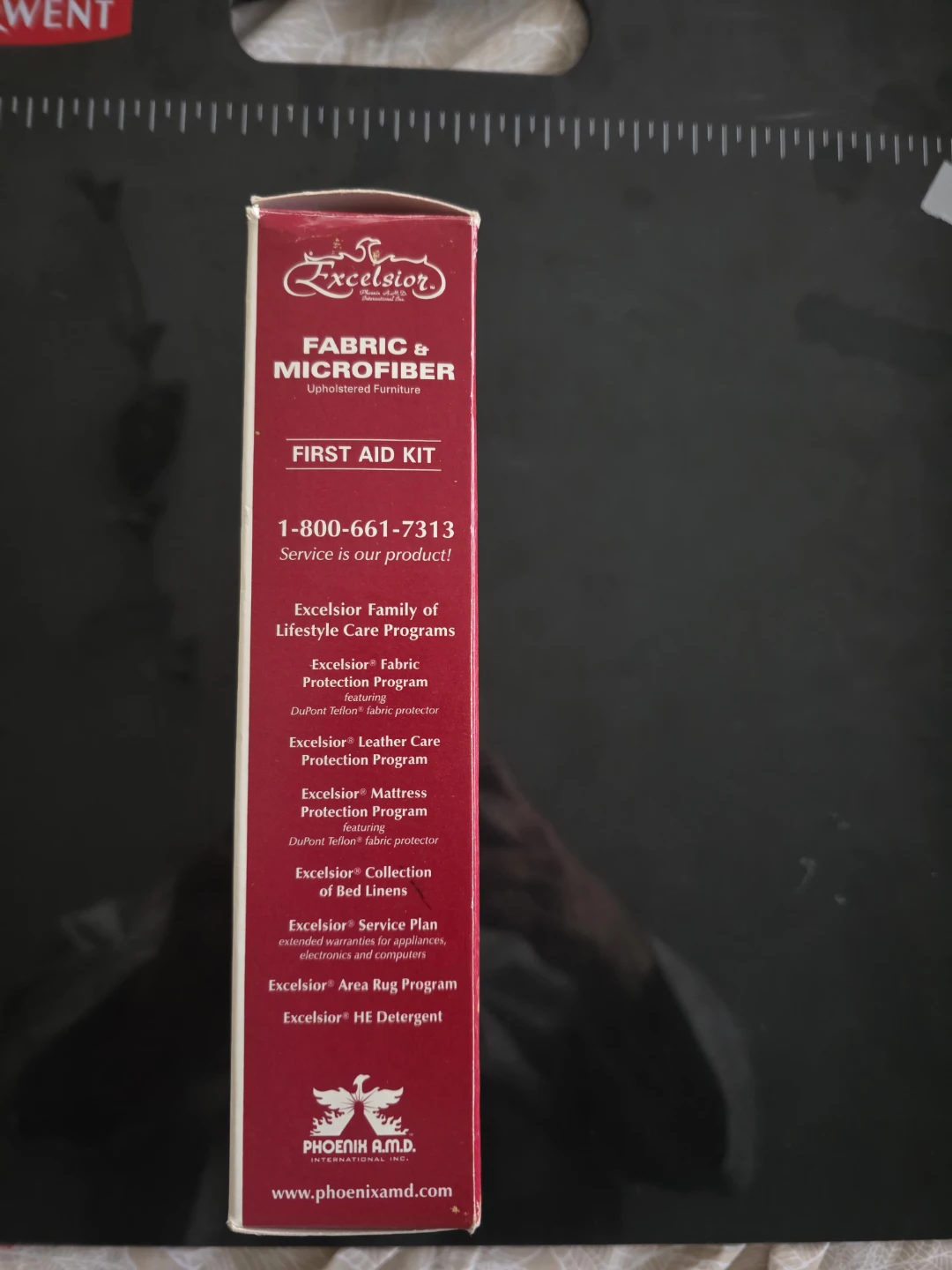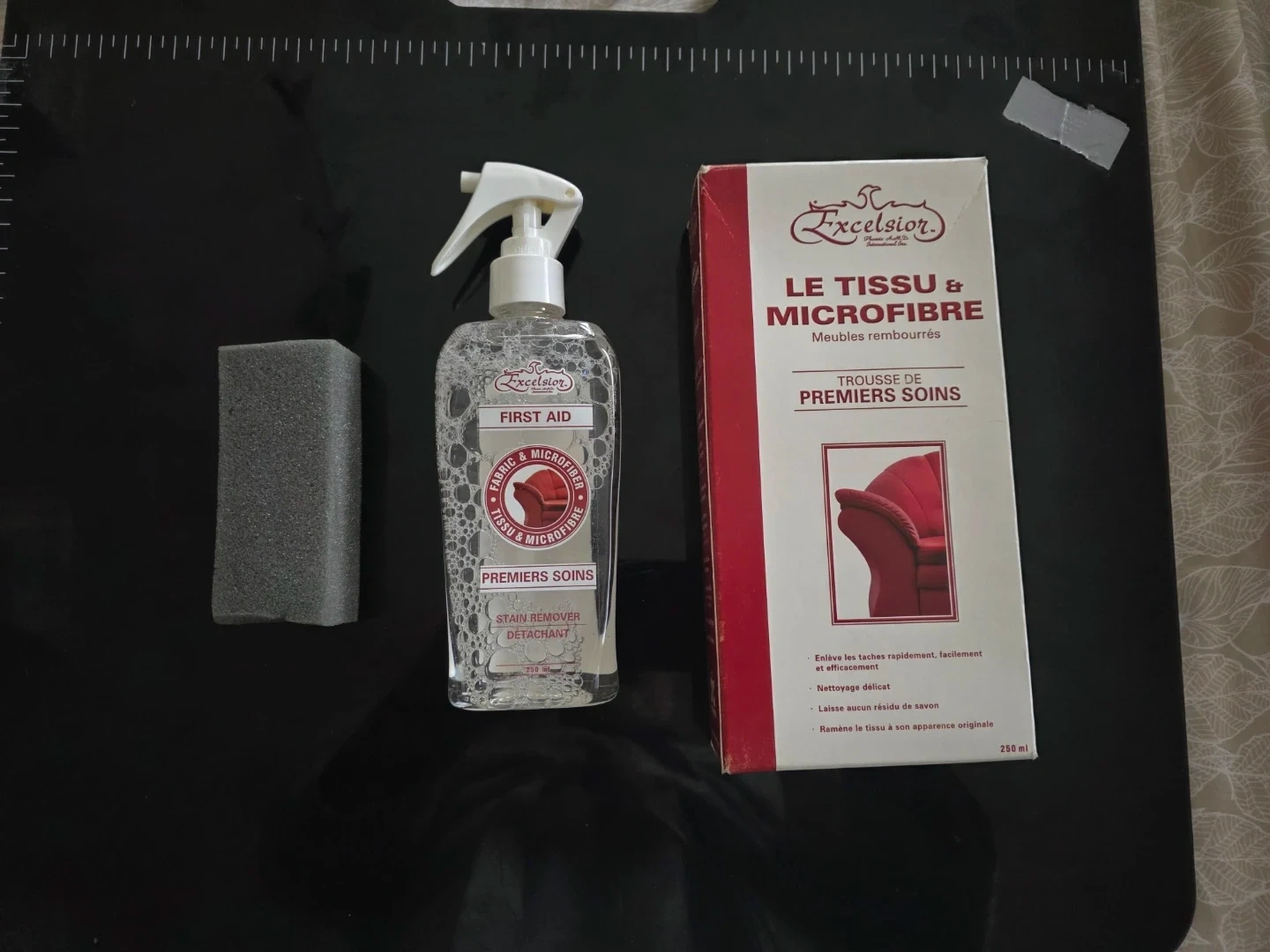 This is an Excelsior Fabric & Microfiber First Aid Kit for upholstered furniture. It comes with a spray bottle and an applicator sponge. The formula removes stains quickly and easily without leaving residue.