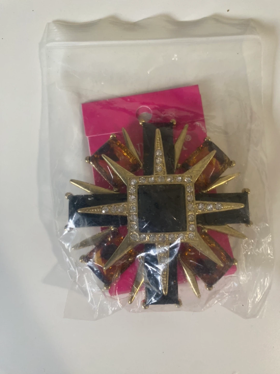 Decorative brooch with gold-tone accents and amber and black stones. Nickel-free construction for sensitive skin. Add a touch of sparkle to any outfit!