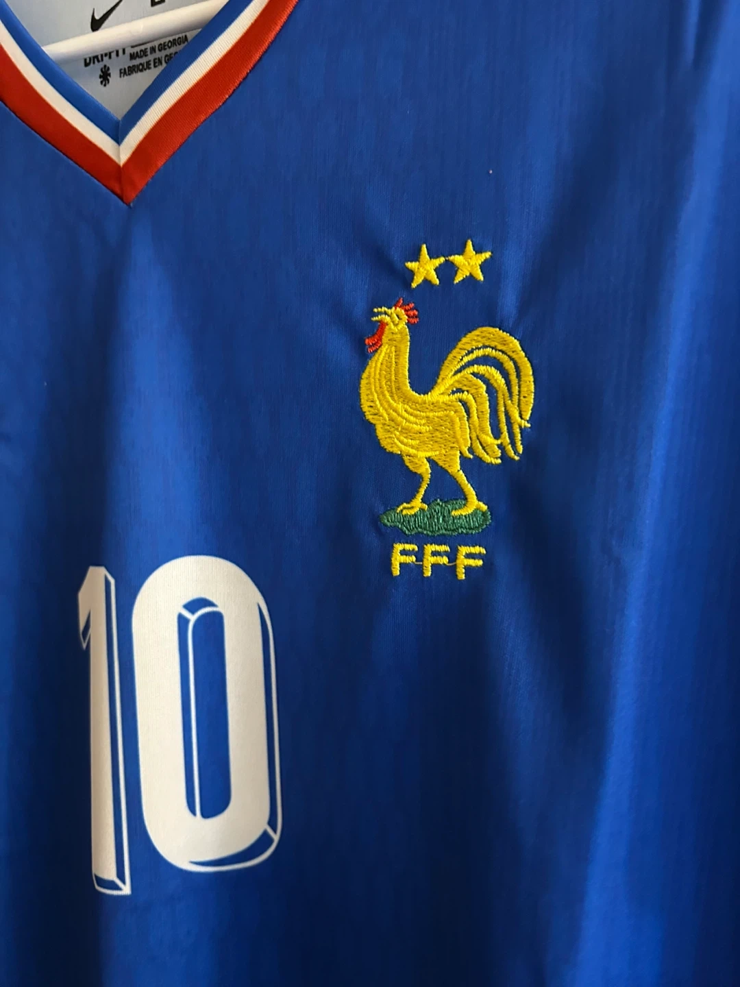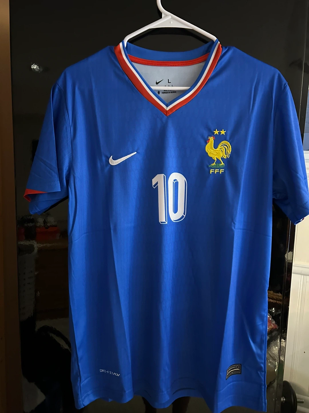 This is a Nike France National Football Team jersey with Mbappé and the number 10 printed on the back. It's made with DRI-FIT technology. This jersey is great for any soccer fan!