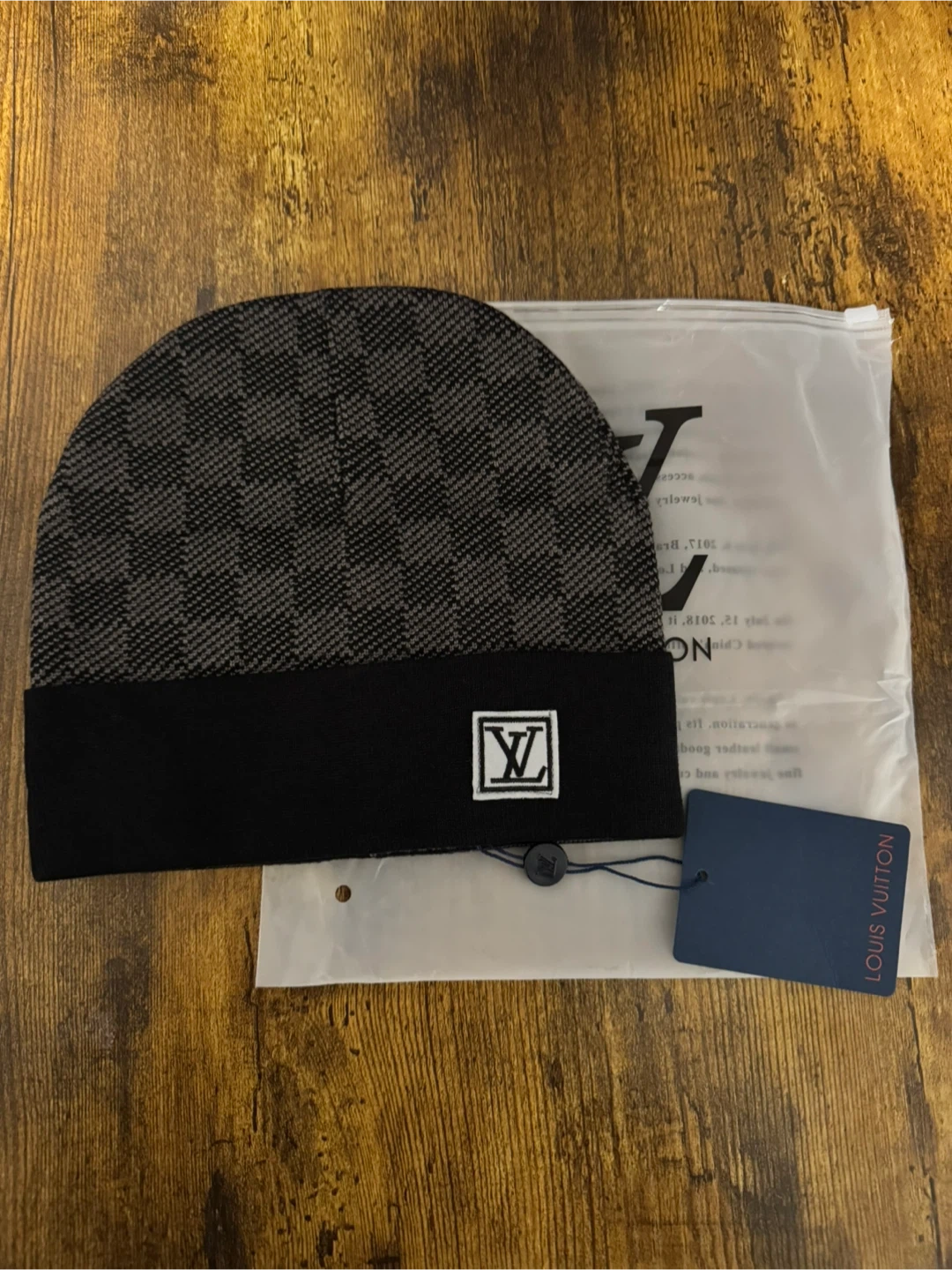 Here's a stylish Louis Vuitton beanie! It features the iconic LV logo and a sleek black design. Perfect for keeping warm and adding a touch of luxury to your outfit