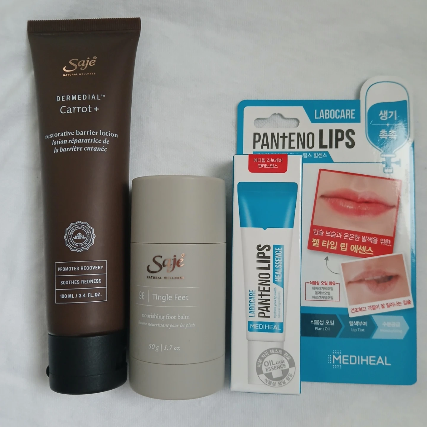 Restorative Barrier Body Butter, Saje Tingle Feet Nourishing Foot Balm, and MEDIHEAL Labocare Pantenolips Healssence.