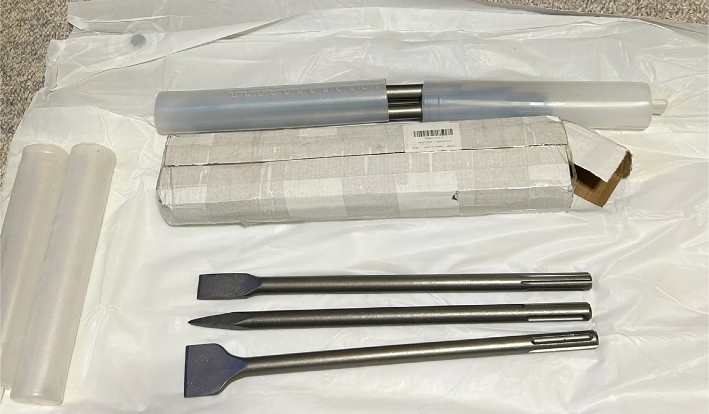 This set includes three SDS Plus chisels: a point chisel, a flat chisel, and a wide flat chisel. They come in protective plastic cases for storage and transport. Ideal for demolition and concrete work!