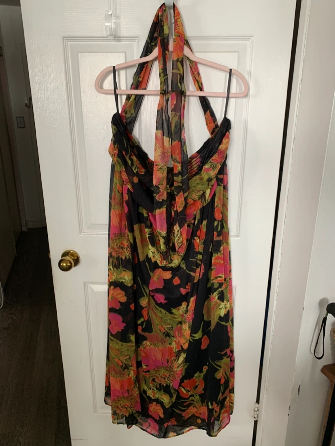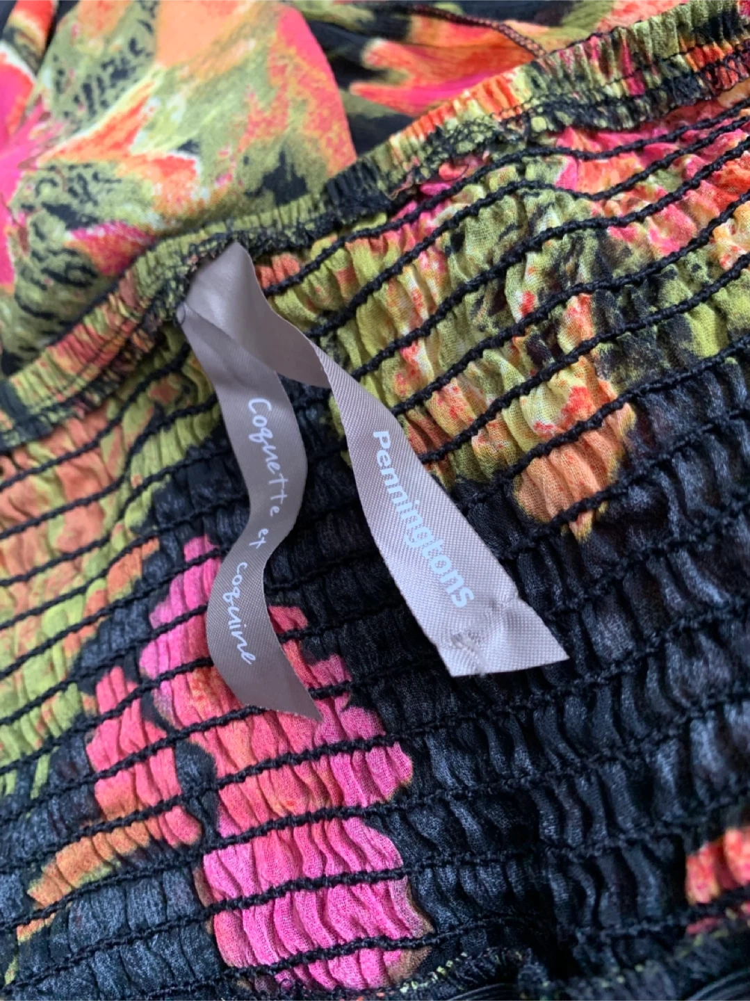 A vibrant floral print (poppies?). It has a smocked bodice and the 2 fun fabric pieces to tie/halter. The garment is fairly lightweight and flowy with lovely layers.