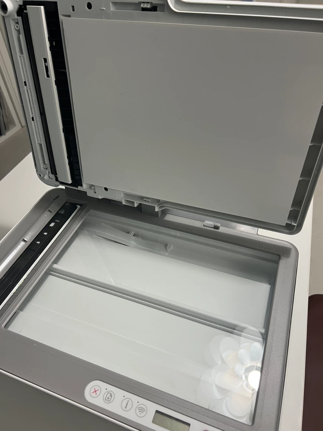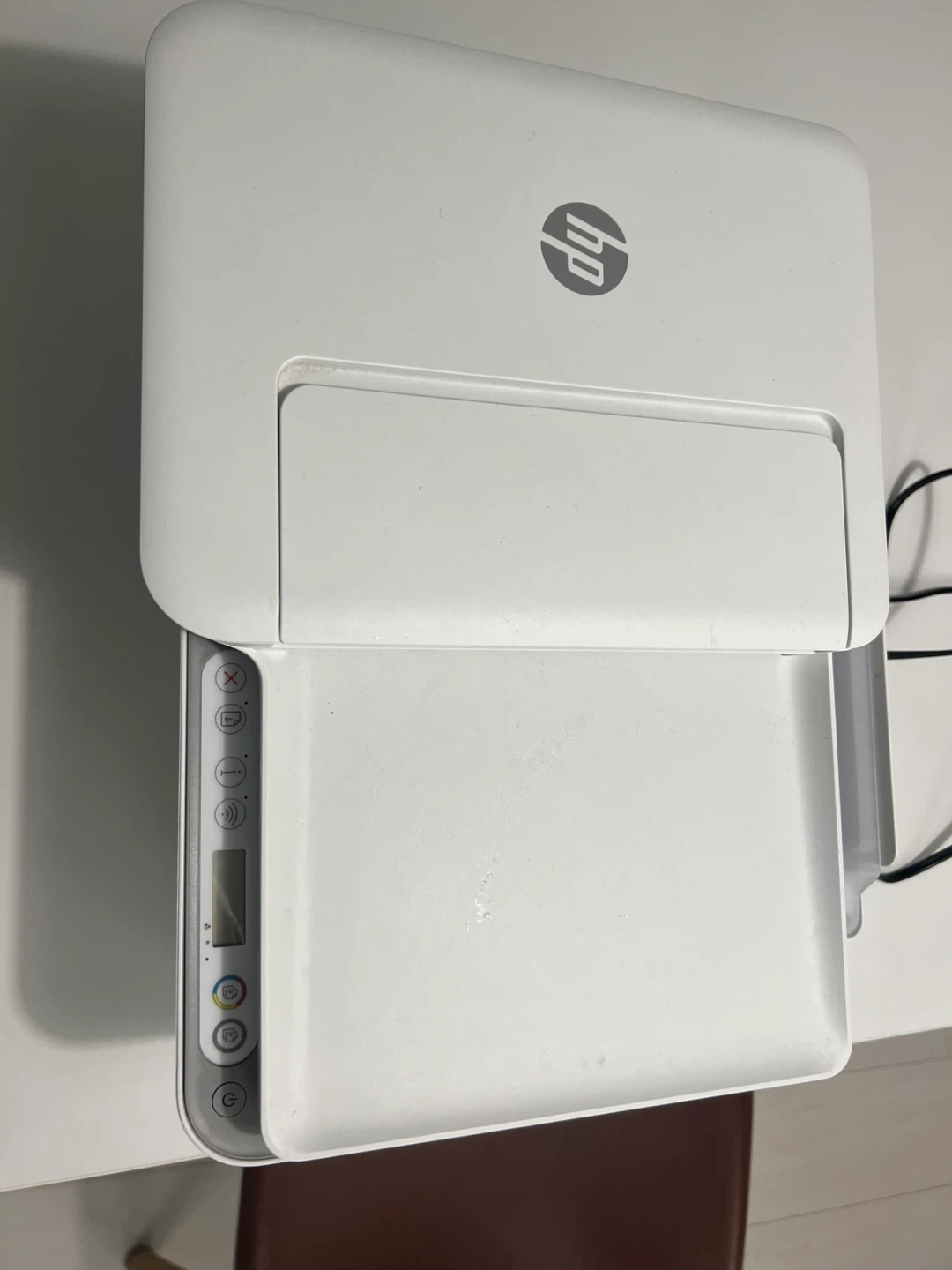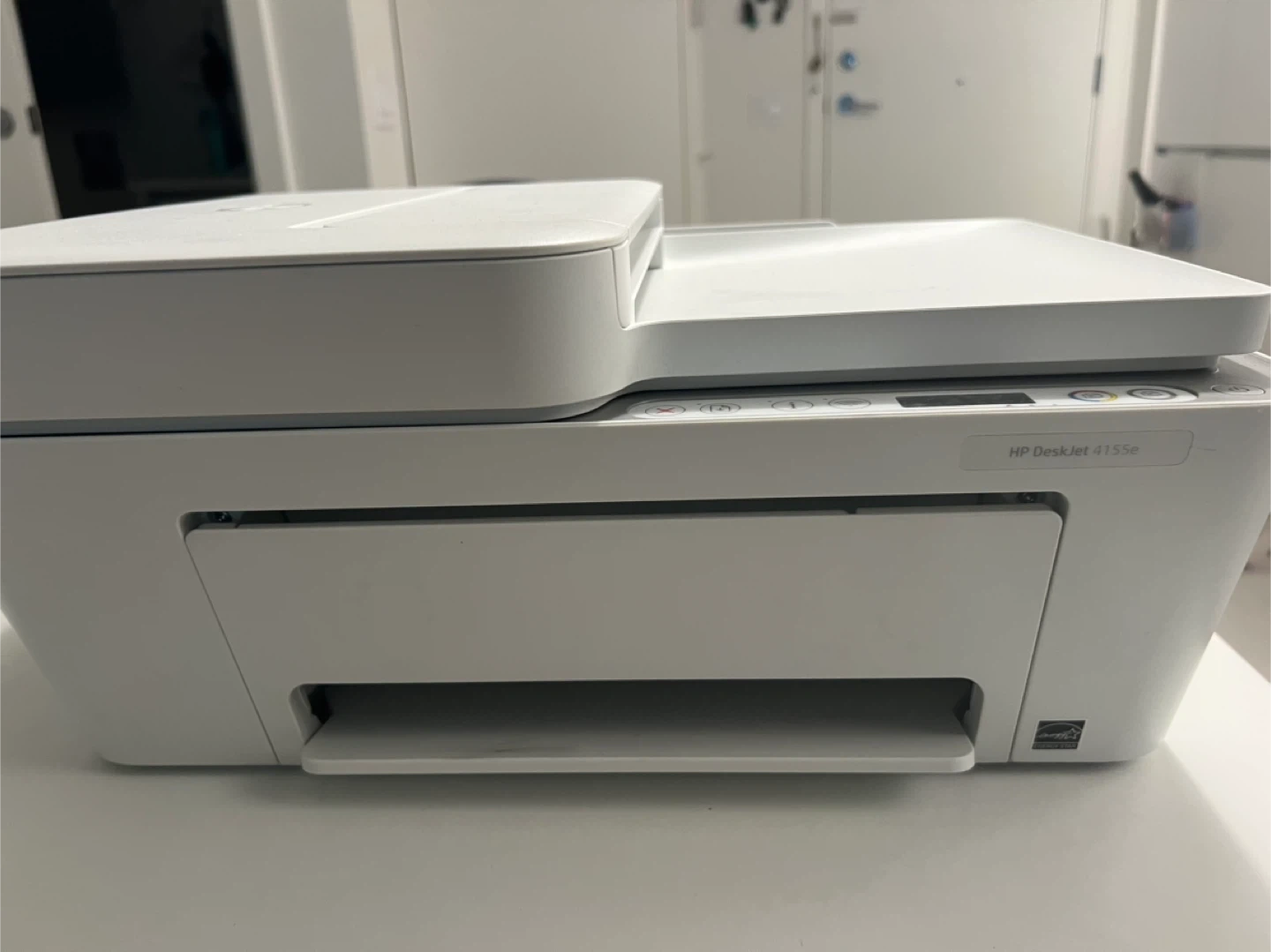 White HP DeskJet 4155e all-in-one printer with scan and copy functions. Includes power cord. This printer is great for home offices needing to print, scan, and copy documents.