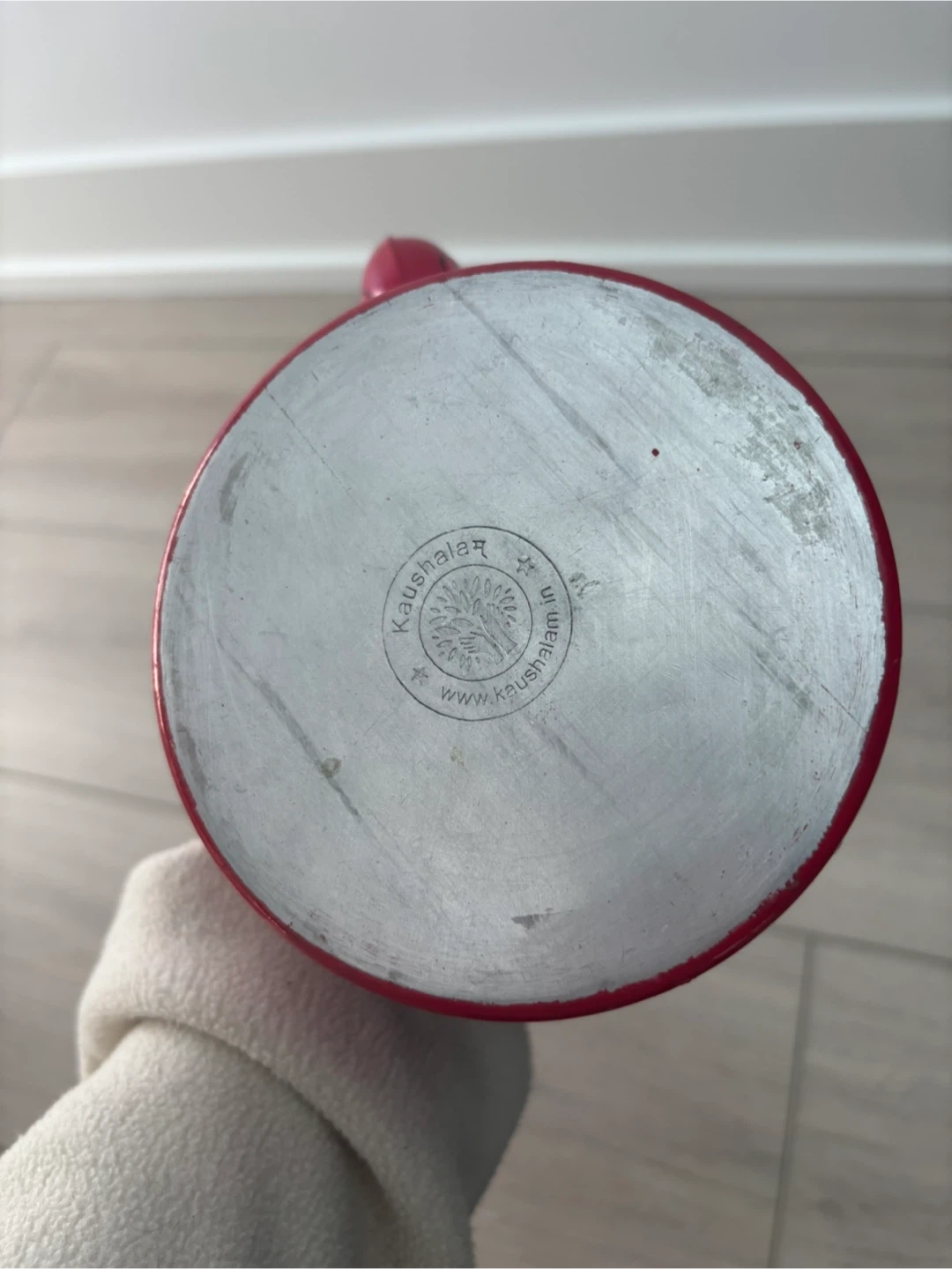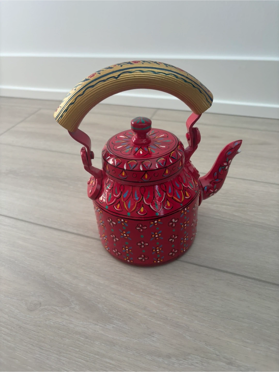 A beautifully hand-painted red tea kettle with a decorative wooden handle. It features intricate floral and patterned designs. This kettle is perfect for adding a unique, colourful touch to your kitchen.
