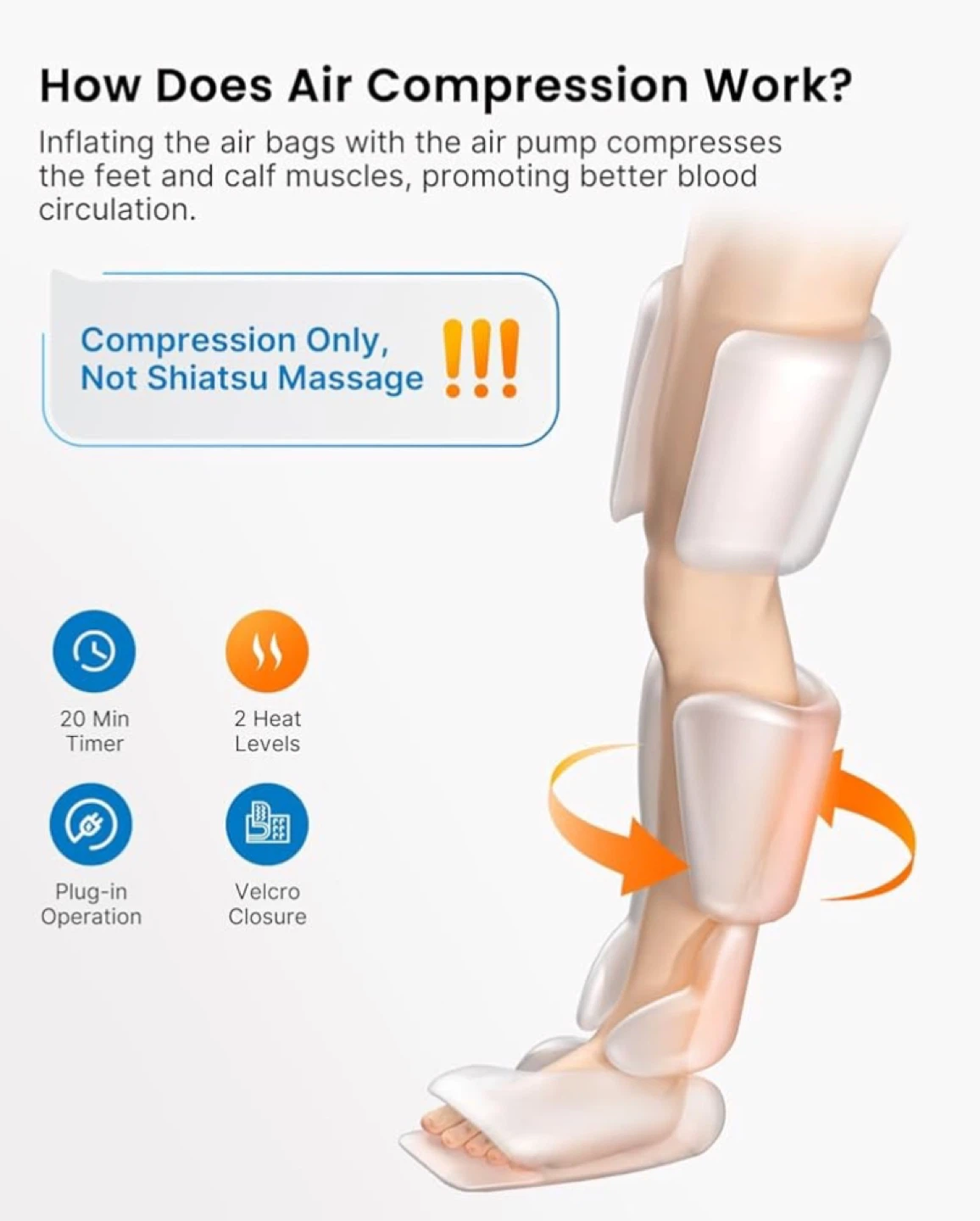 Air Compression Massager: The leg massager massages your feel,calf and thigh by inflating and deflating, helps to relieve swelling and pain, promotes recovery after exercise, very convenient to use at home! Note: This is not a shiatsu massager