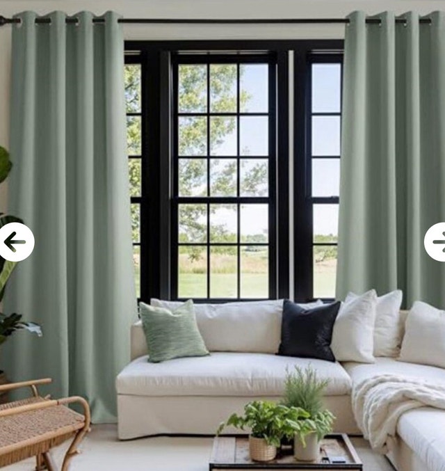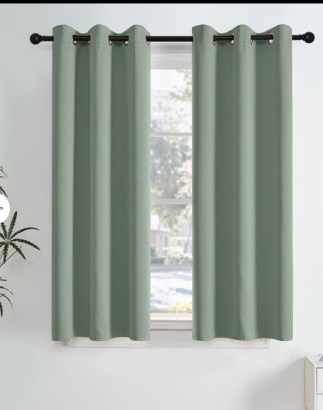 These NICETOWN sage green room darkening curtains, each 63 inches long, come as a set of two panels, perfect for a living room, bedroom, or nursery and offer thermal insulation and noise reduction. These curtains are used, but in good condition. Specifications: * Brand: NICETOWN * Colour: Sage Green * Length: 63 inches * Features: Thermal Insulated, Blackout, Noise Reducing Comparable curtains usually sell for around $30-$60 used. If you're reading this, the curtains are still available! Grab them before they flutter away! 730-1238