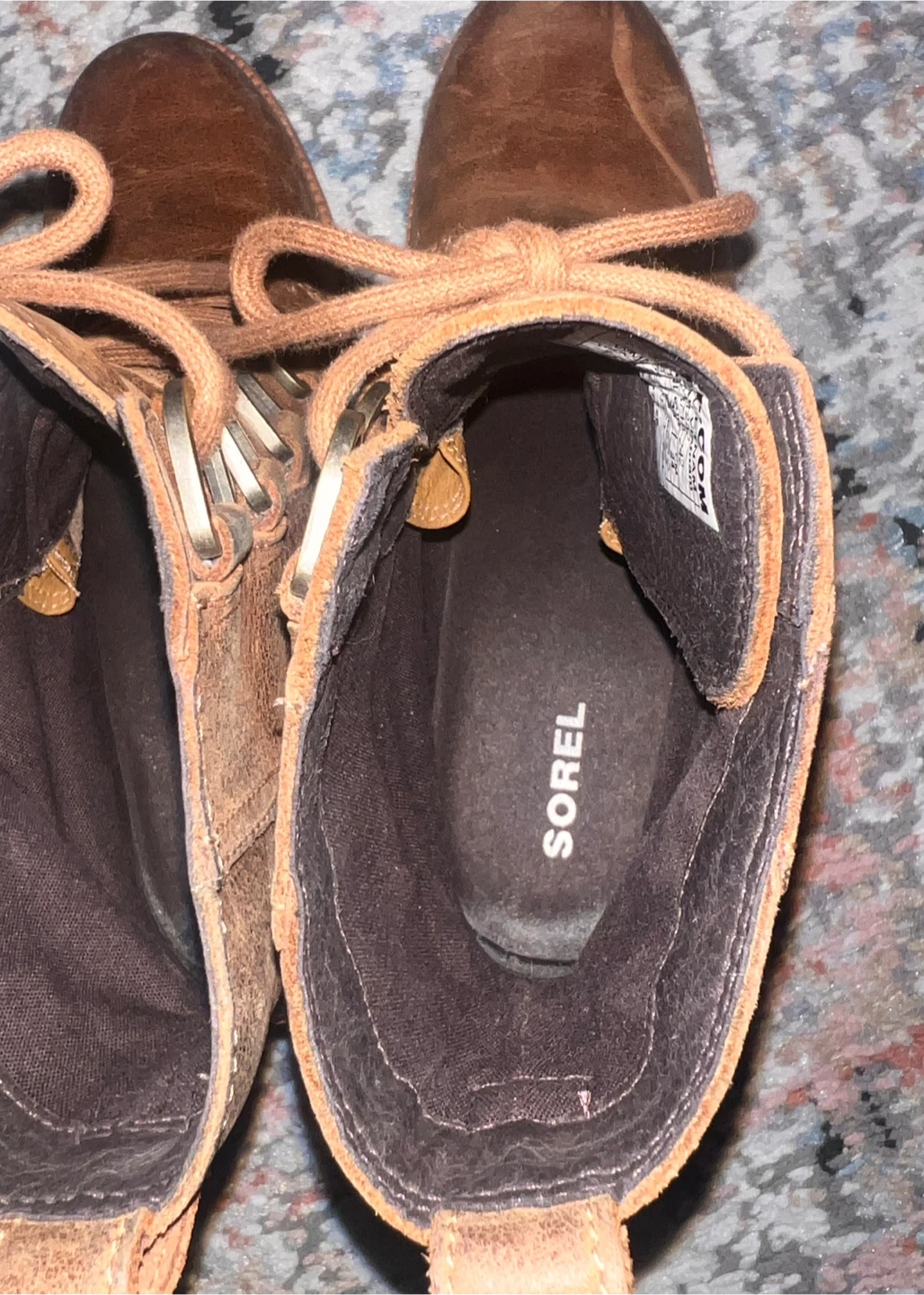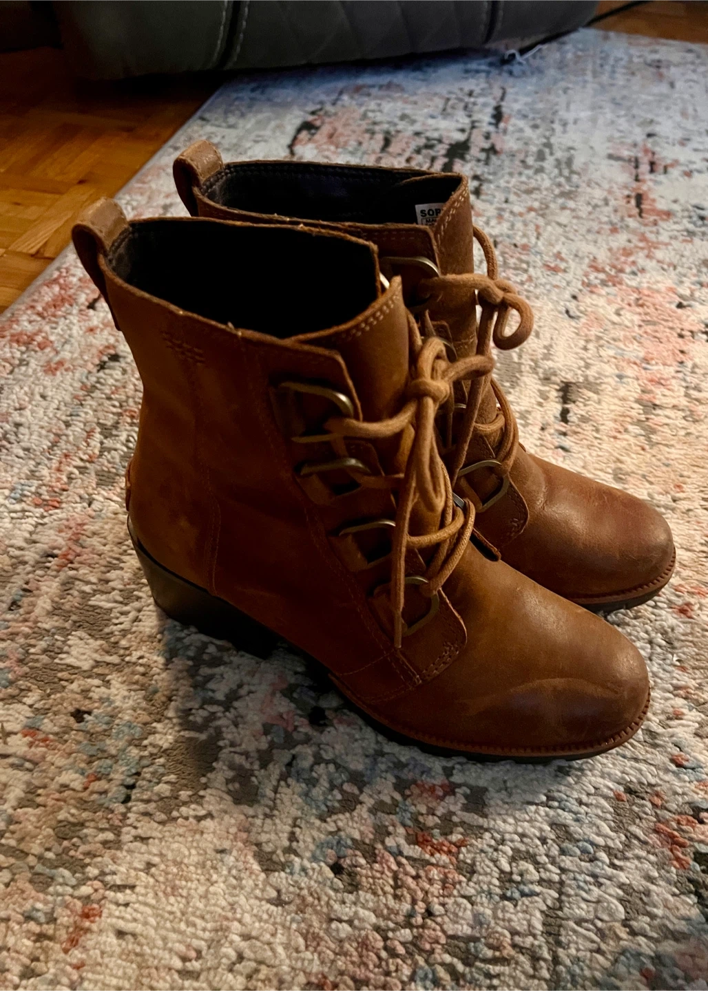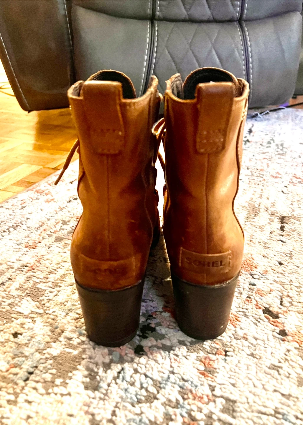 These preloved Sorel ankle boots are made of brown leather with a lace-up front. They feature a block heel and decorative hardware. Size 7 USA, 5 UK, 38 EUR, 24 CM.