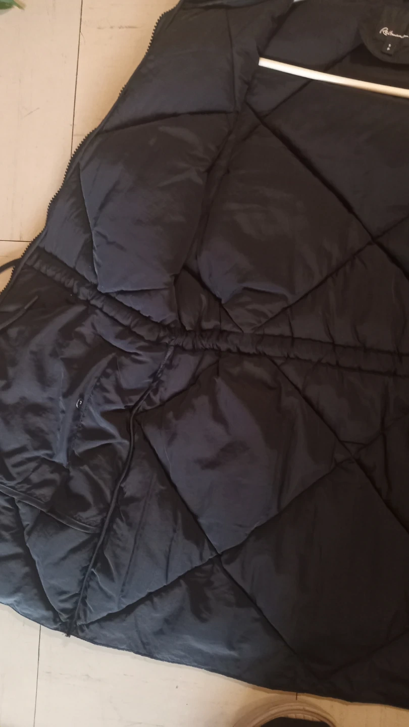 Black puffer vest with a cinched waist and full zip closure. It has two front pockets. Material is polyester.