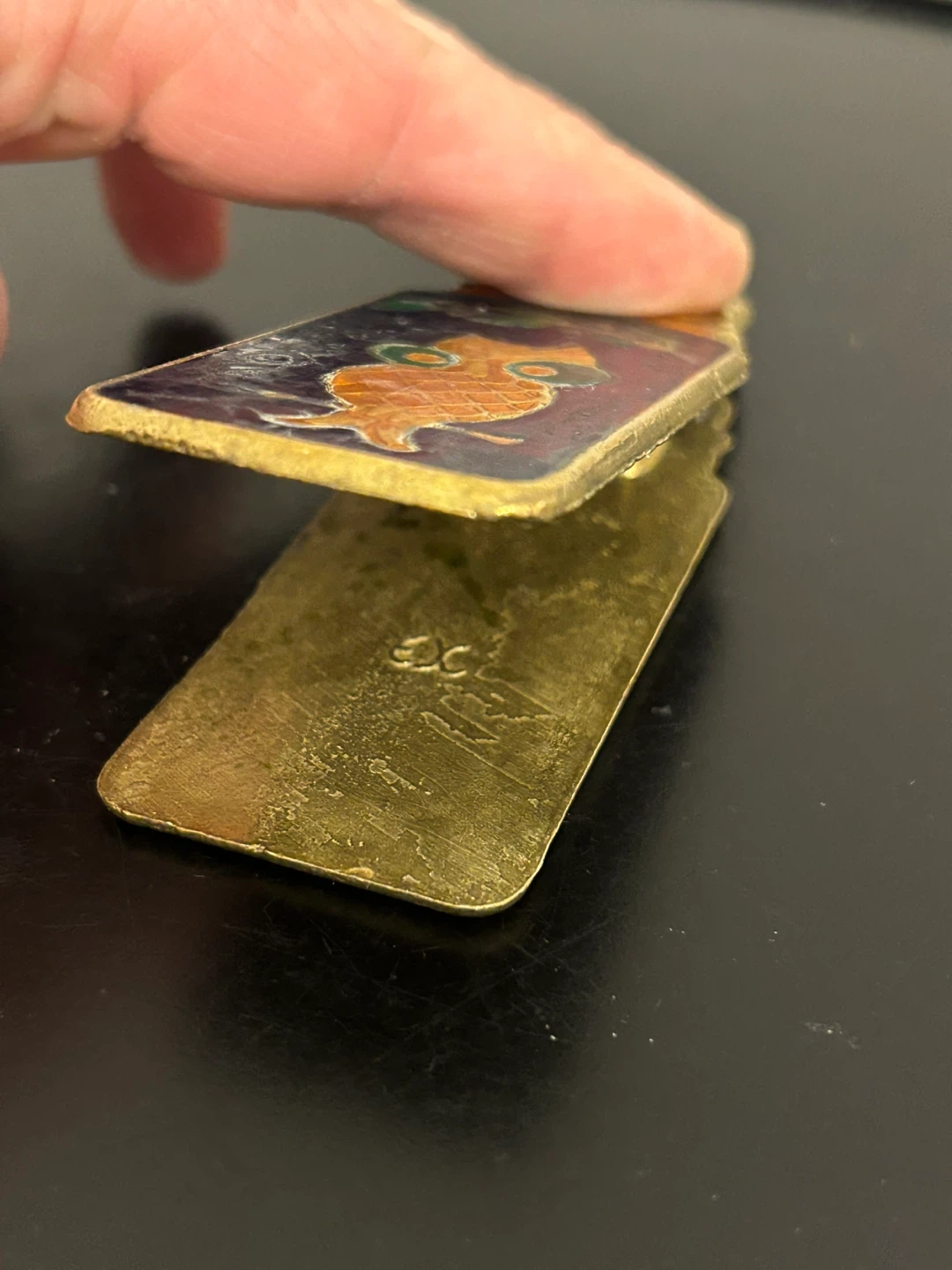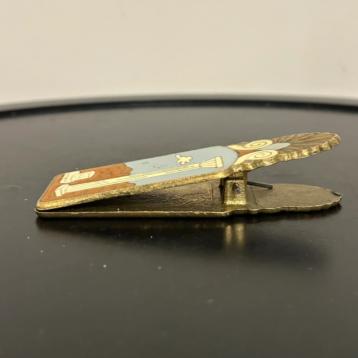 Unique vintage solid brass clip featuring detailed double-sided hand-painted enamel. This sturdy spring clip is both functional and decorative, suitable for use as a money clip, desk memo holder, or book clip.