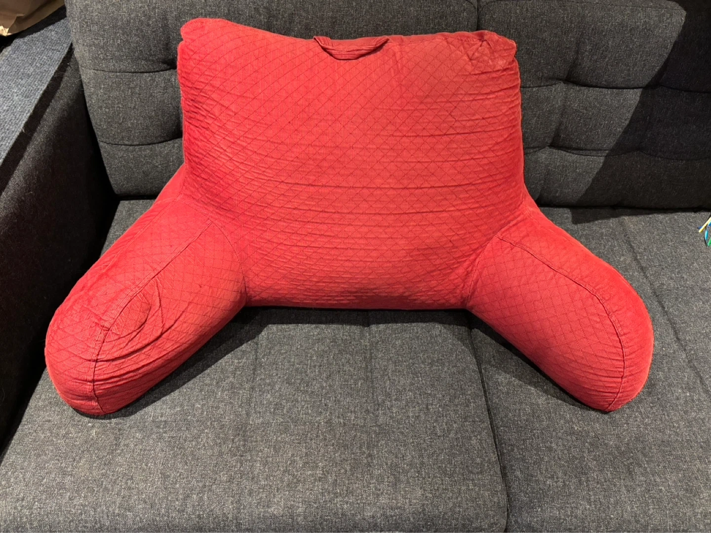 Soft corduroy reading pillow in red. Features armrests for extra comfort and a handle on top for easy moving. Cash and pickup preferred.