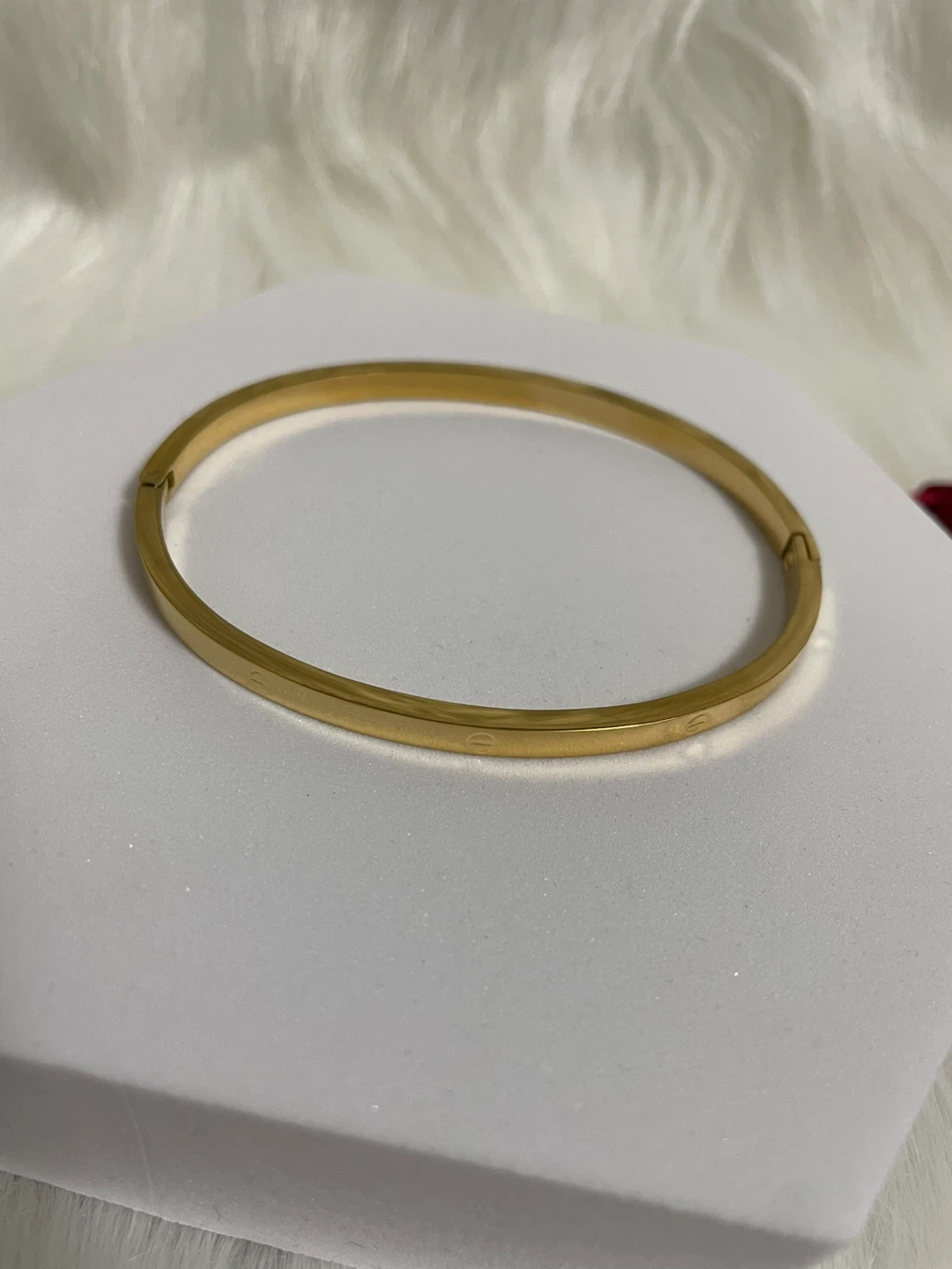 A classic Cartier Love bracelet in gold. This iconic piece features the brand's signature screw motif. It's a timeless accessory that adds a touch of elegance to any outfit.